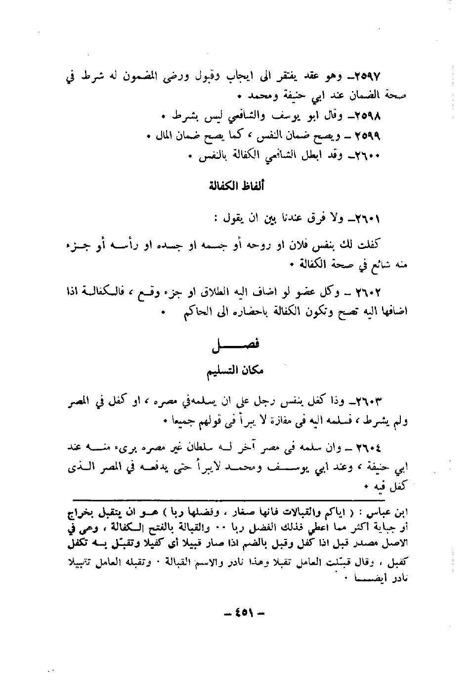 2604 - وأن سلمه في مصر آخر له سلطان غير مصره برئ منه عند أبي حنيفة، وعند أبي يوسف ومحمد لا يبرأ حتى يدفعه في المصر الذي كفل فيه.