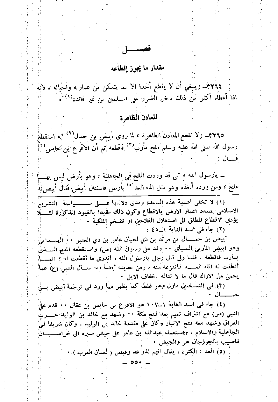 3265 - ولا تقطع المعادن الظاهرة، لما روى أبيض بن حمال أنه استقطع رسول الله صلى الله عليه وسلم ملح مأرب فأقطعه ثم إن الأقرع بن حابس قال: