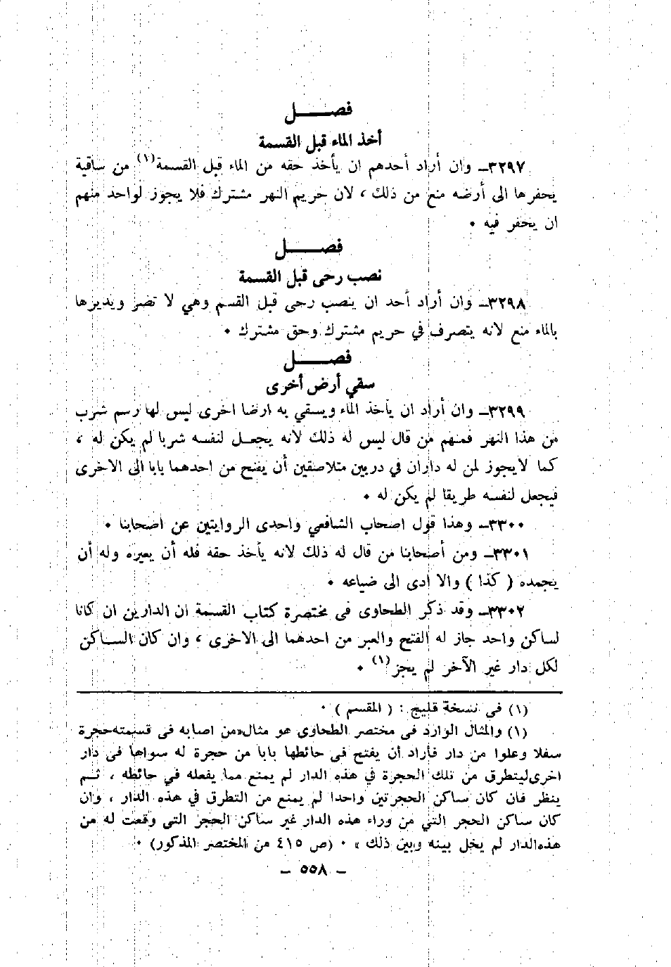 3297 - وإن أراد أحدهم أن يأخذ حقه من الماء قبل القسمة من ساقيه يحفرها إلى أرضه منع من ذلك؛ لأن حريم النهر مشترك فلا يجوز لواحد منهم أن يحفر فيه.