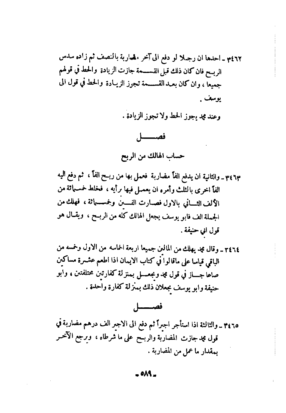 3465 - والثالثة إذا استأجر أجيرًا ثم دفع إلى الأجير ألف درهم مضاربة في قول محمد جازت المضاربة والربح على ما شرطاه، ويرجع الآخر بمقدار ما عمل من المضاربة.