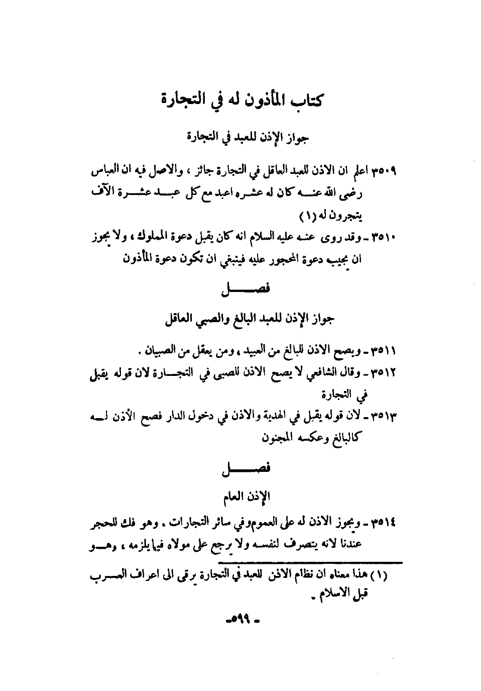 3509 - اعلم أن الإذن للعبد العاقل في التجارة جائز، والأصل فيه أن العباس رضي الله عنه كان له عشرة أعبد مع كل عبد عشرة آلف يتجرون له.