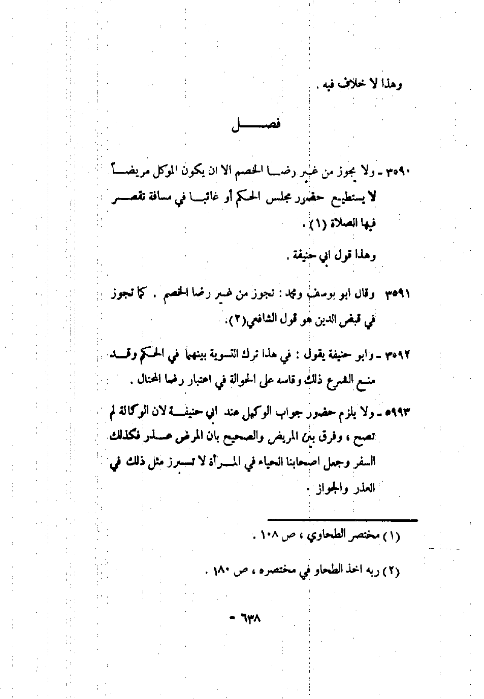 3688 - ولا يجوز من غير رضا الخصم إلا أن يكون الموكل مريضًا لا يستطيع حضور مجلس الحكم أو غائبًا في مسافة تقصر فيها الصلاة.