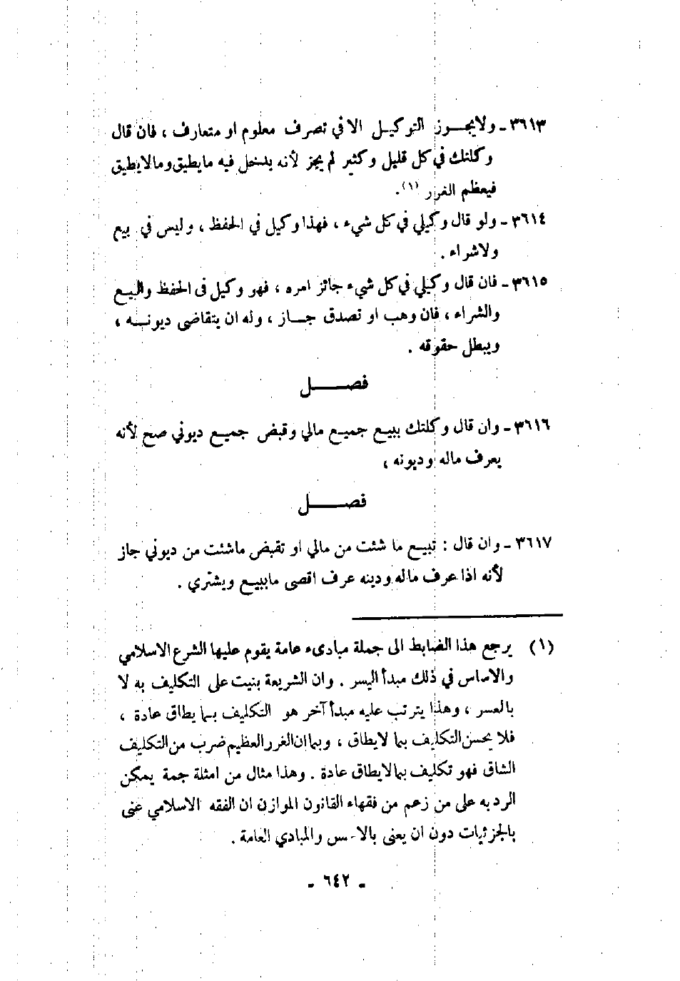 3710 - ولا يجوز التوكيل إلا في تصرف معلوم أو متعارف، فإن قال وكلتك في كل قليل وكثير لم يجز لأنه يدخل فيه ما يطبق وما لا يطيق فيعظم الغرر.