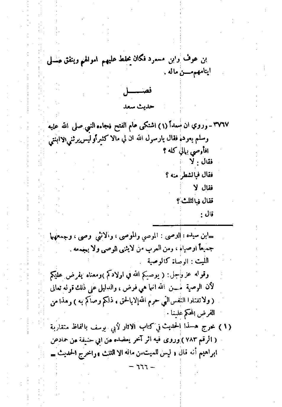 3857 - وروي أن سعدًا اشتكى عام الفتح فجاءه النبي صلى الله عليه وسلم يعوده فقال يا رسول الله إن لي مالاً كثيرًا وليس يرثني إلا ابنتي أفأوصي بمالي كله؟