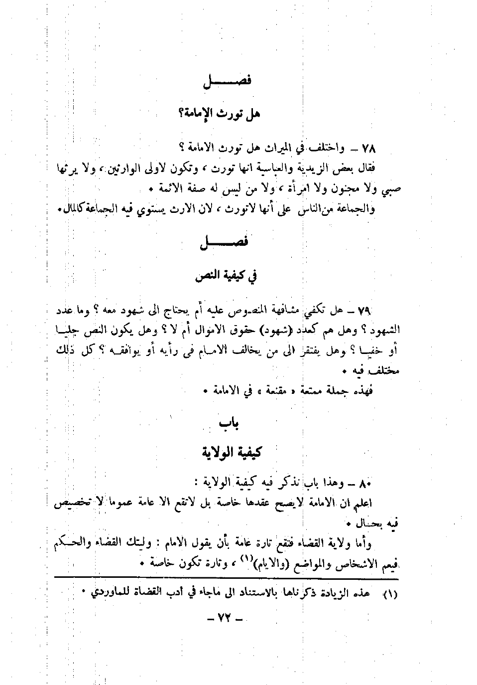 79 - هل تكفي مشافهة المنصوص عليه أم يحتاج إلى شهود معه؟ وما عدد الشهود؟ وهل هم كعدد (شهود) حقوق الأموال أم لا؟ وهل يكون النص جليًا أو خفيًا؟ وهل يفتقر إلى من يخالف الإمام في رأيه أو يوافقه؟ كل ذلك مختلف فيه.