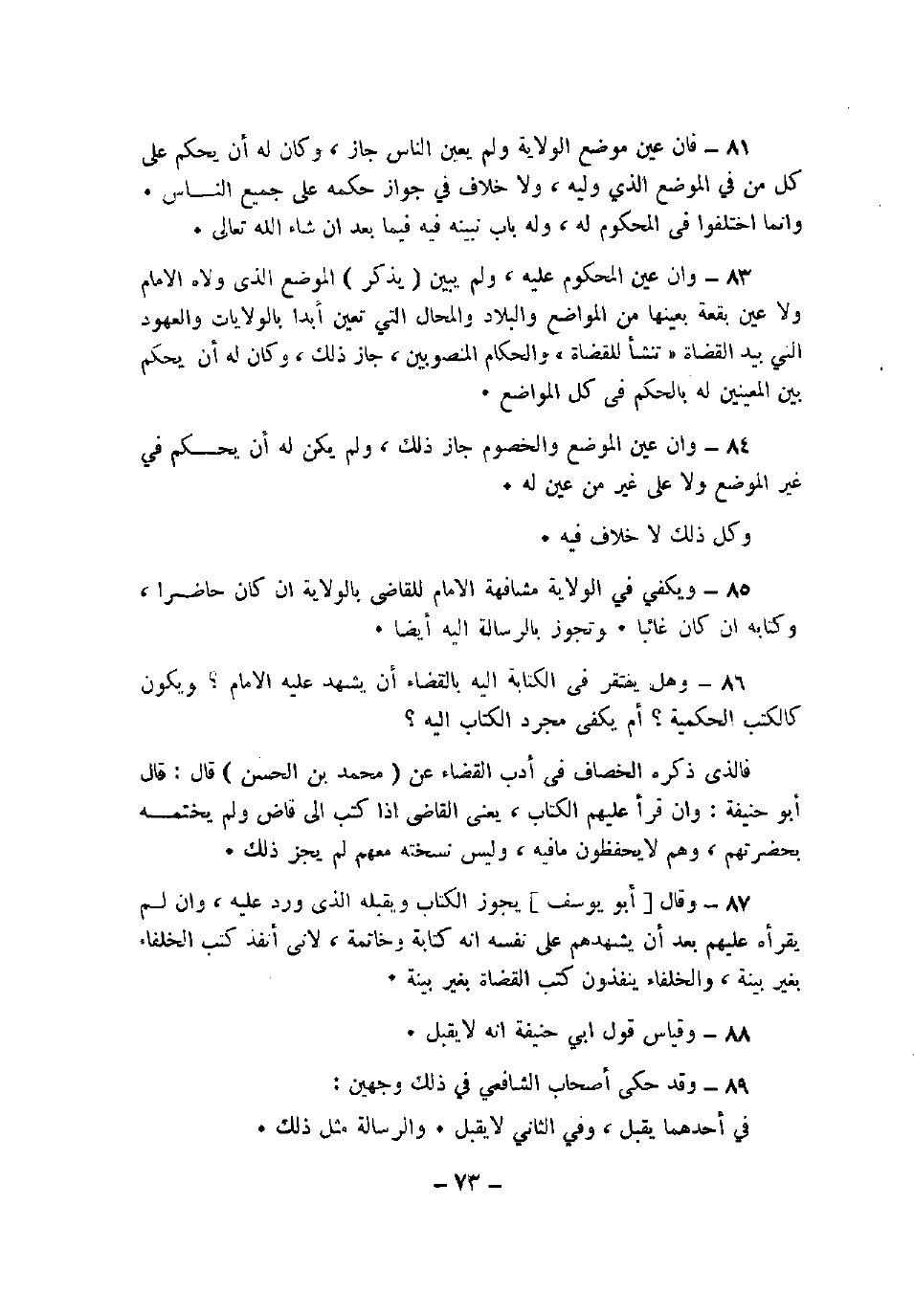 86 - وهل يفتقر في الكتابة إليه بالقضاء أن يشهد عليه الإمام؟ ويكون كالكتب الحكمية؟ أم يكفى مجرد الكتاب إليه؟