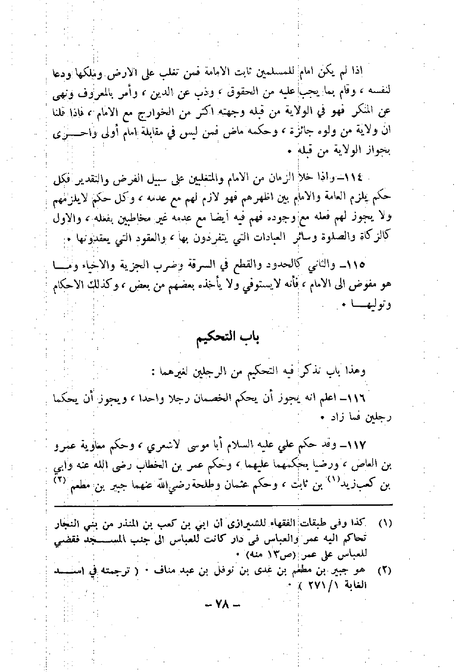 117 - وقد حكم علي عليه السلام أبا موسى الأشعري، وحكم معاوية عمرو بن العاص، ورضيا بحكمهما عليهما، وحكم عمر بن الخطاب رضي الله عنه وأبي بن كعب زيد بن ثابت، وحكم عثمان وطلحة رضي الله عنهما جبير بن مطعم