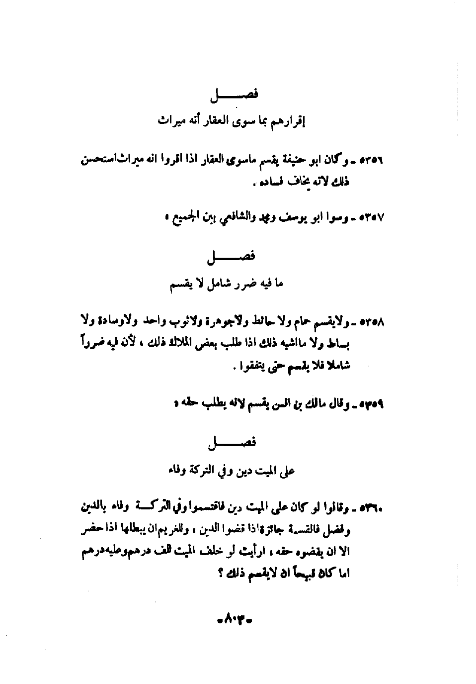 5358 - ولا يقسم حمام ولا حائط ولا جوهرة ولا ثوب واحد ولا وسادة ولا بساط ولا ما أشبه ذلك إذا طلب بعض الملاك ذلك، لأن فيه ضرراً شاملاً فلا يقسم حتى يتفقوا.