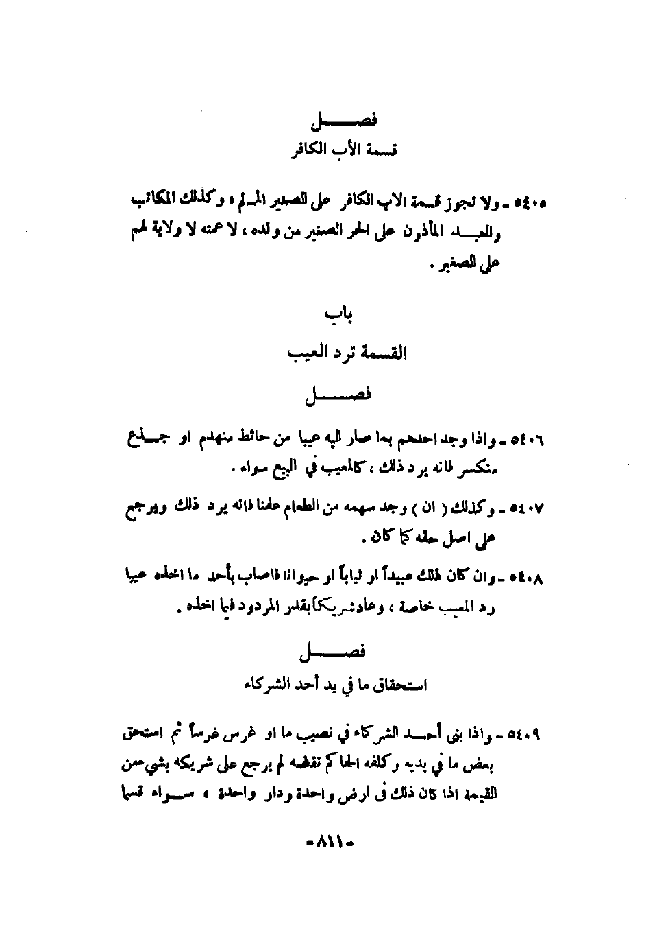 5408 - وإن كان ذلك عبيداً أو ثياباً أو حيواناً فأصاب بأحد ما أخذ عيباً رد المعيب خاصة، وعاد شريكاً بقدر المردود فيما أخذه.