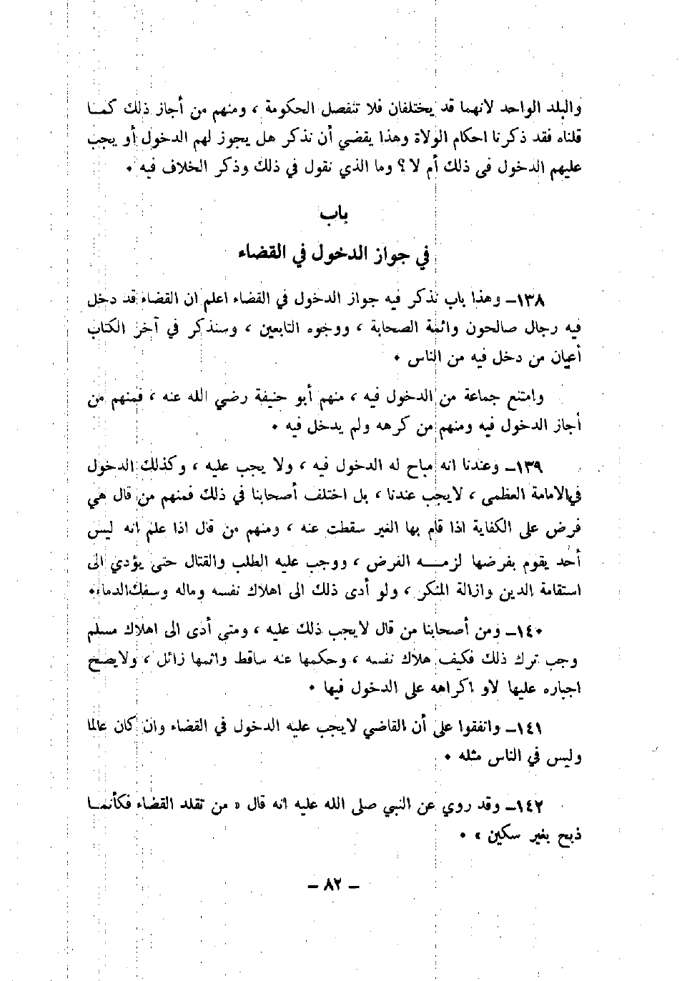 138 - وهذا باب نذكر فيه جواز الدخول في القضاء اعلم أن القضاء قد دخل فيه رجال صالحون وأئمة الصحابة، ووجوه التابعين، وسنذكر في آخر الكتاب أعيان من دخل فيه من الناس.