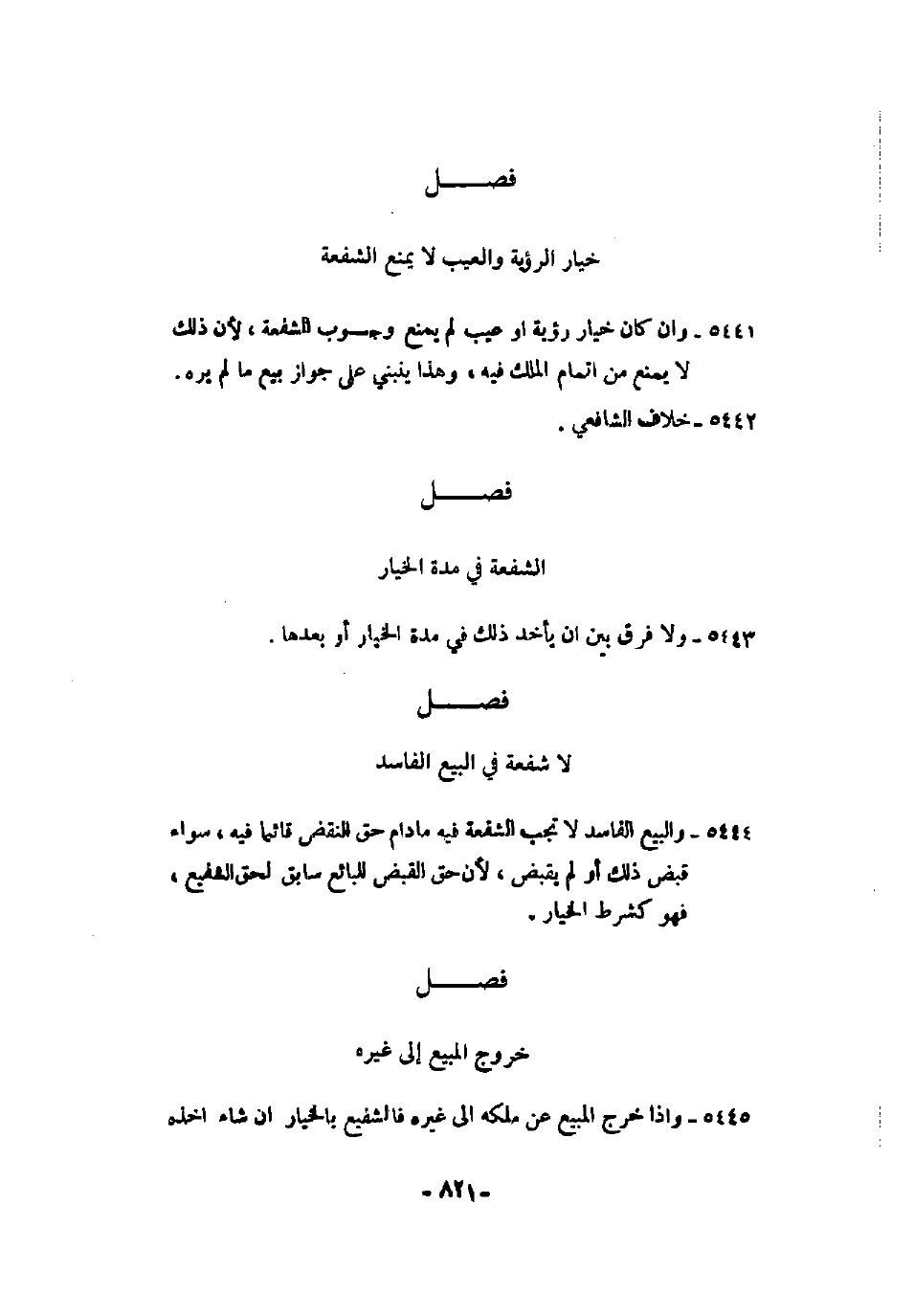 5444 - والبيع الفاسد لا تجب الشفعة فيه مادام حق النقض قائماً فيه، سواء قبض ذلك أو لم يقبض، لأنه حق القبض للبائع سابق لحق الشفيع، فهو كشرط الخيار.