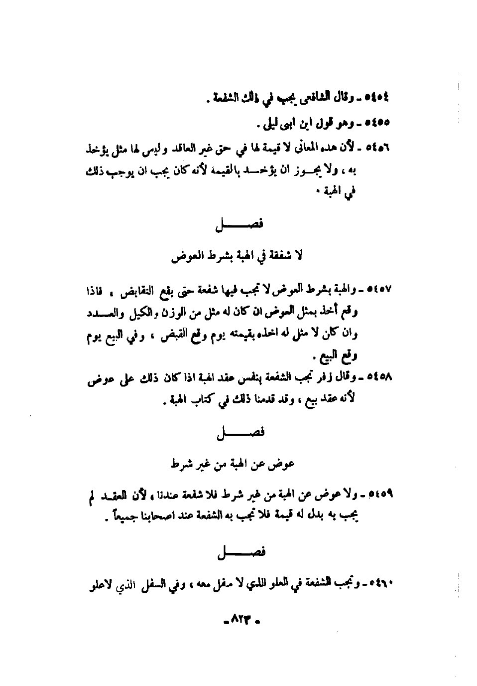 5459 - ولا عوض عن الهبة من غير شرط فلا شفعة عندنا، لأن العقد لم يجب به بدل له قيمة فلا تجب به الشفعة عند أصحابنا جميعاً.