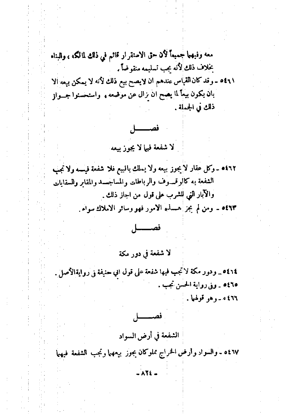 5462 - وكل عقار لا يجوز بيعه ولا يملك بالبيع فلا شفعة فيه ولا تجب الشفعة به كالوقوف والرباطات والمساجد والمقابر والسقايات والآبار التي للشرب على قول من أجاز ذلك.