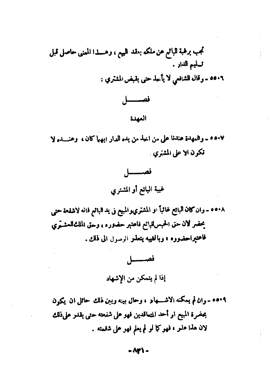 5508 - وإن كان البائع غائباً أو المشتري والمبيع في يد البائع فإنه لا شفعة حتى يحضر لأن حق الحبس للبائع فاعتبر حضوره، وحق الملك للمشتري فاعتبرا حضوره، وبالغيبة يتعذر الوصول إلى ذلك.