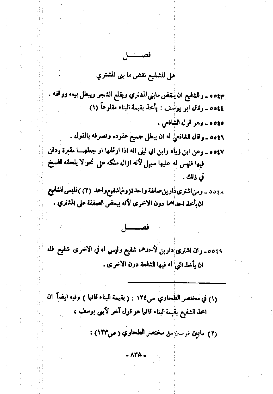 5548 - ومن اشترى دارين صفقة واحدة (ولهما شفيع واحد) فليس الشفيع أن يأخذ أحداهما دون الأخرى لأنه ببعض الصفقة على المشتري.