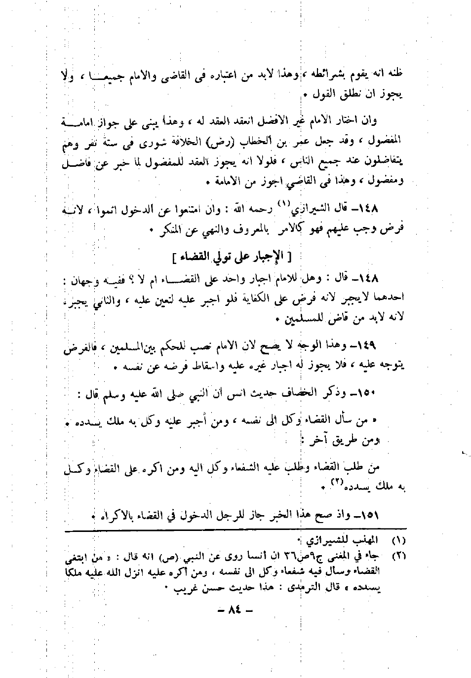 148 - قال: وهل للإمام إجبار واحد على القضاء أم لا؟ ففيه وجهان: أحدهما لا يجبر لأنه فرض على الكفاية فلو أجبر عليه لتعين عليه، والثاني يجبره لأنه لابد من قاض للمسلمين.
