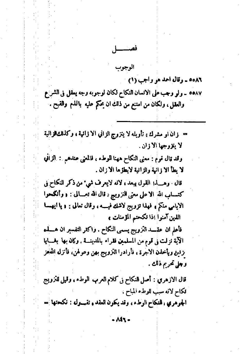 5587 - ولو وجب على الإنسان النكاح لكان لوجوبه وجه يعقل في الشرع والعقل، ولكان من امتنع من ذلك أن يحكم عليه بالذم والقبح.