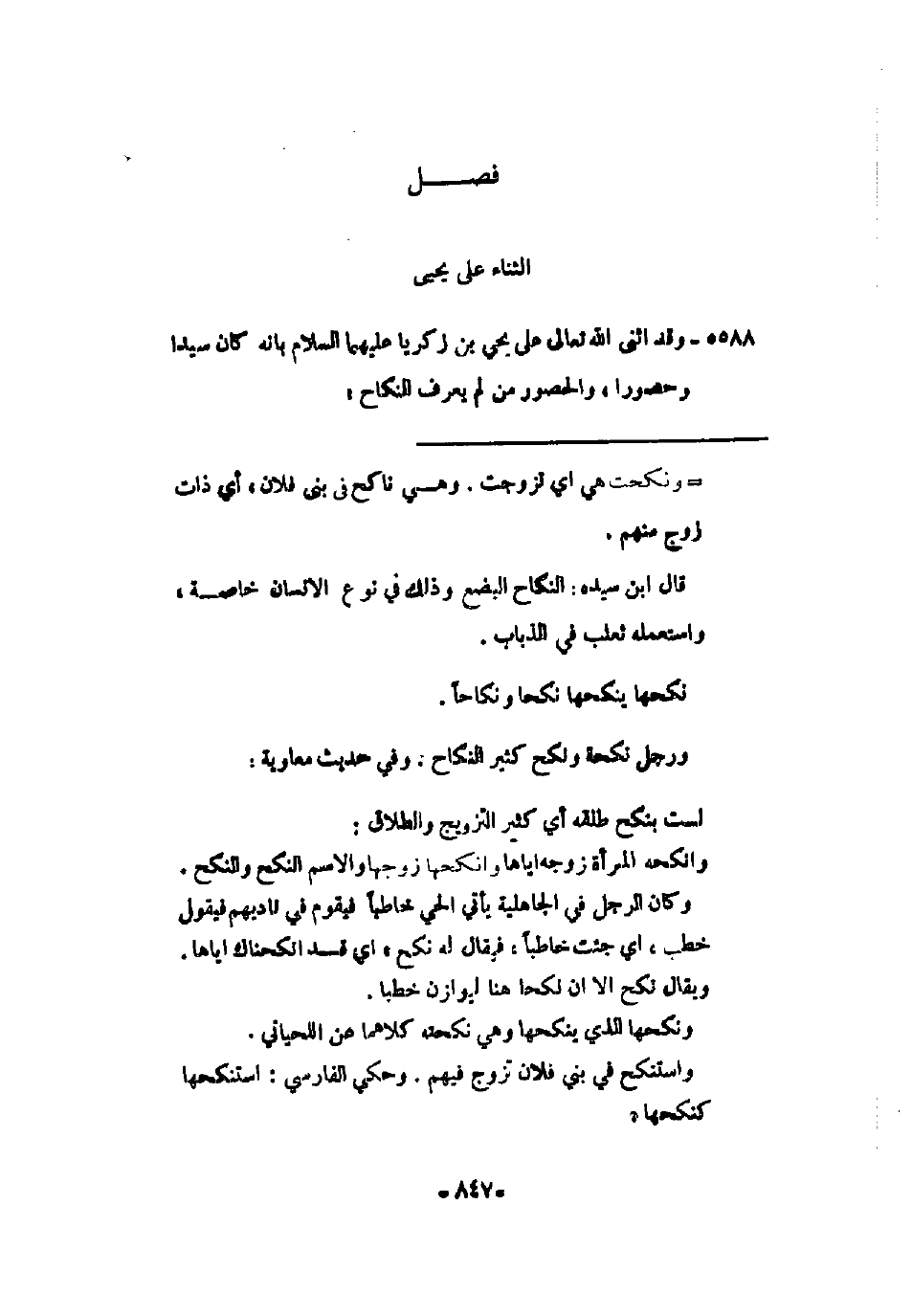 5588 - وقد أثنى الله تعالى على يحيى بن زكريا عليهما السالم بأنه كان سيداً وحصورا، والحصور من لم يعرف النكاح.