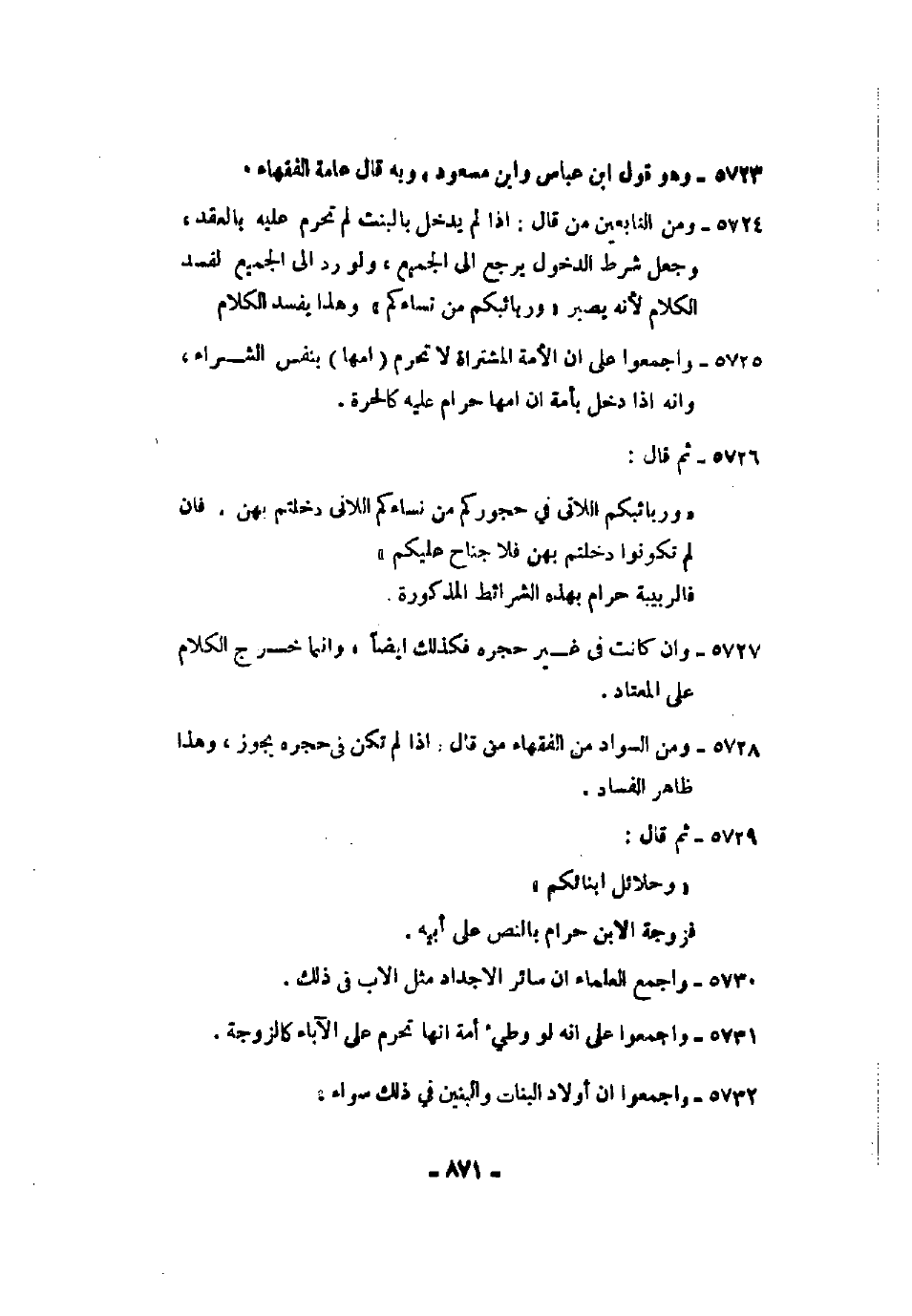 5724 - ومن التابعين من قال: إذا لم يدخل بالبنت لم تحرم عليه بالعقد، وجعل شرط الدخول يرجع إلى الجمع، ولو رد إلى الجميع لفسد الكلام لأنه يصير "وربائبكم من نساءكم" وهذا يفسد الكلام.