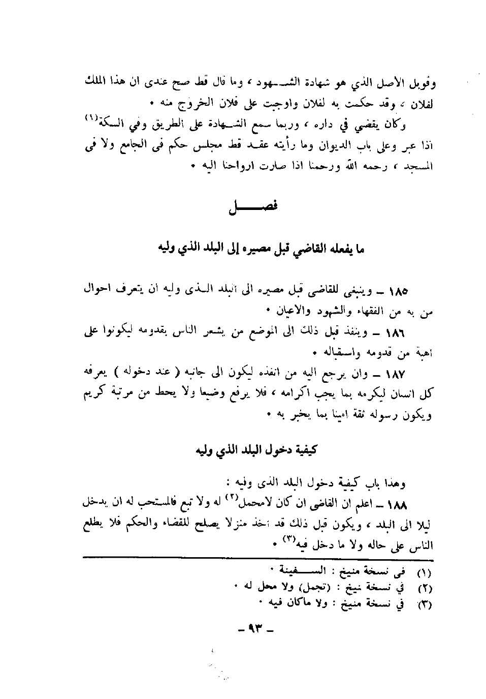 185 - وينبغي للقاضي قبل مصيره إلى البلد الذي وليه أن يتعرف أحوال من به من الفقهاء والشهود والأعيان.