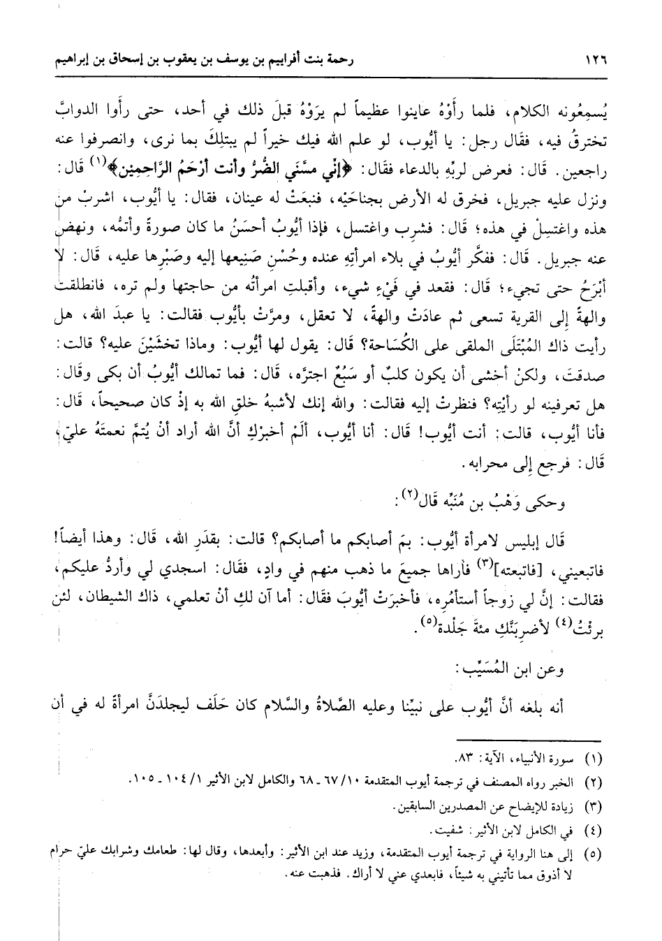 (5) إلى هنا الرواية في ترجمة أيوب المتقدمة وزيد عند ابن الاثير: وأبعدها وقال لها: طعامك وشرابك علي حرام لا أذوق مما تأتيني به شيئا فابعدي عنى لا أراك