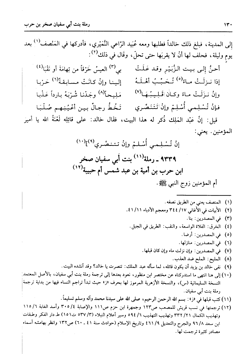 (12) ترجمتها في نسب قريش للمصعب ص 123 وجمهرة ابن حزم ص 111 والاصابة 4 / 305 وأسد الغابة 6 / 115 وتهذيب الكمال 21 / 332 وتهذيب التهذيب 6 / 594 وسير أعلام النبلاء (3 / 537 ت 151) ط دار الفكر وطبقات ابن سعد 8 / 96 والجرح والتعديل 9 / 461 وتاريخ الاسلام (حوادث سنة 41 - 60) ص 132 وانظر بهامشه أسماء مصادر كثيرة ترجمت لها