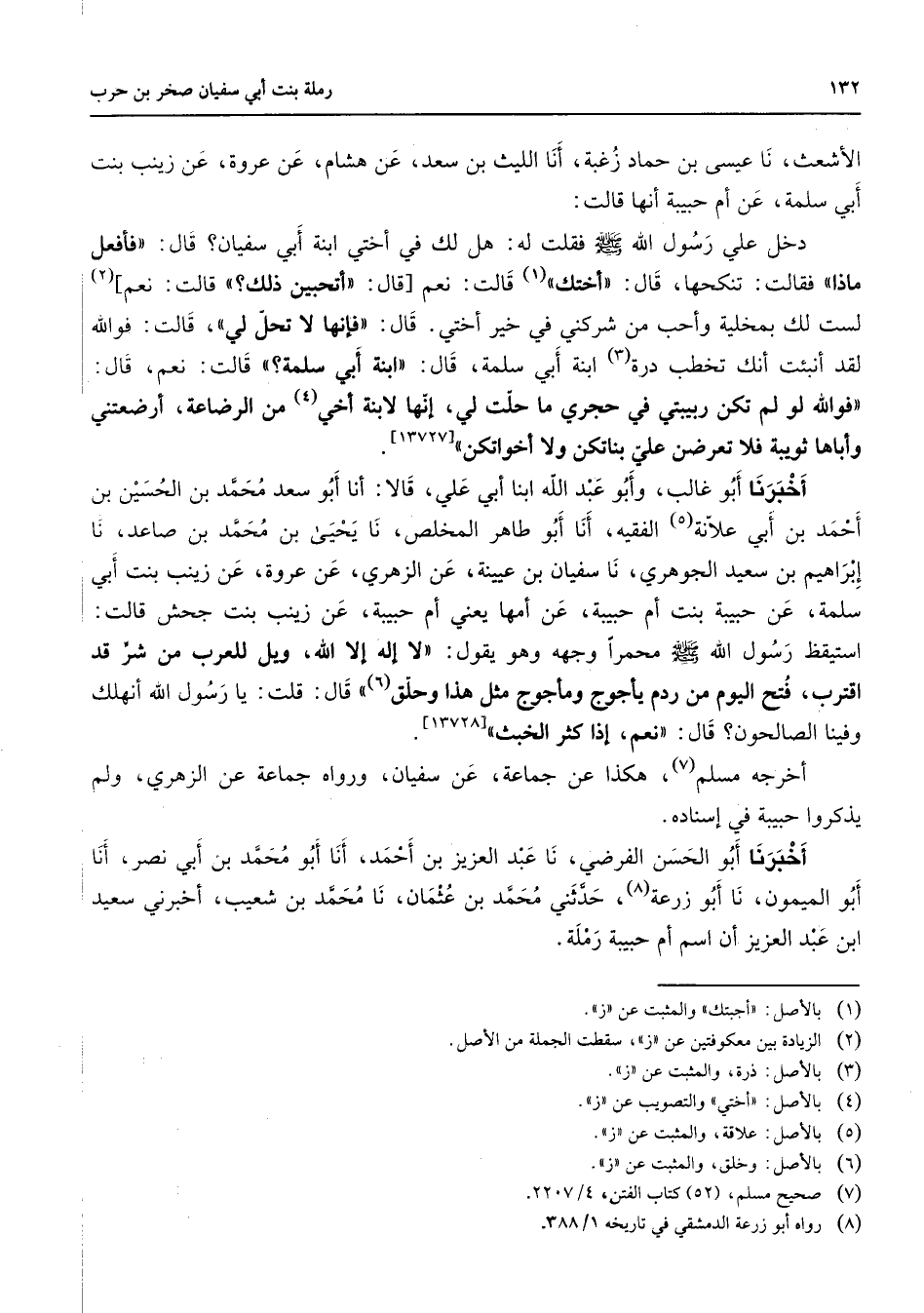 الأشعث نا عيسى بن حماد زغبة أنا الليث بن سعد عن هشام عن عروة عن زينب بنت أبي سلمة عن أم حبيبة أنها قالت دخل علي رسول الله (صلى الله عليه وسلم) فقلت له هل لك في أختي ابنة أبي سفيان قال فأفعل ماذا فقالت تنكحها قال أختك (1) قالت نعم قال أتحبين ذلك قالت نعم (2) لست لك بمخلية وأحب من شركني في خير أختي قال فإنها لا تحل لي قالت فوالله لقد أنبئت أنك تخطب درة (3) ابنة أبي سلمة قال ابنة أبي سلمة قالت نعم قال فوالله لو لم تكن ربيبتي في حجري ما حلت لي إنها لابنة أخي (4) من الرضاعة أرضعتني وأباها ثويبة فلا تعرضن علي بناتكن ولا أخواتكن أخبرنا أبو غالب وأبو عبد الله ابنا أبي علي قالا أنا أبو سعد محمد بن الحسين بن أحمد بن أبي علانة (5) الفقيه أنا أبو طاهر المخلص نا يحيى بن محمد بن صاعد نا إبراهيم بن سعيد الجوهري نا سفيان بن عيينة عن الزهري عن عروة عن زينب بنت أبي سلمة عن حبيبة بنت أم حبيبة عن أمها يعني أم حبيبة عن زينب بنت جحش قالت استيقظ رسول الله (صلى الله عليه وسلم) محمرا وجهه وهو يقول لا إله إلا الله ويل للعرب من شر قد اقترب فتح اليوم من ردم يأجوج ومأجوج مثل هذا وحلق (6) قال قلت يا رسول الله أنهلك وفينا الصالحون قال نعم إذا كثر الخبث أخرجه مسلم (7) هكذا عن جماعة عن سفيان ورواه جماعة عن الزهري ولم يذكروا حبيبة في إسناده أخبرنا أبو الحسن الفرضي نا عبد العزيز بن أحمد أنا أبو محمد بن أبي نصر أنا أبو الميمون نا أبو زرعة (8) حدثني محمد بن عثمان نا محمد بن شعيب أخبرني سعيد ابن عبد العزيز أن اسم أم حبيبة رملة