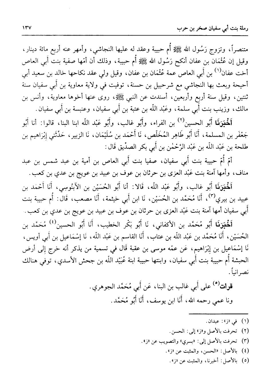 متنصرا وتزوج رسول الله (صلى الله عليه وسلم) أم حبيبة وعقد له عليها النجاشي وأمهر عنه أربع مائة دينار وقيل أن عثمان بن عفان أنكح رسول الله (صلى الله عليه وسلم) أم حبيبة وذلك أن أمها صفية بنت أبي العاص أخت عفان (1) بن أبي العاص عمة عثمان بن عفان وقيل ولي عقد نكاحها خالد بن سعيد أبي أحيحة وبعث بها النجاشي مع شرحبيل بن حسنة توفيت في ولاية معاوية بن أبي سفيان سنة ثنتين وقيل سنة أربع وأربعين أسندت عن النبي (صلى الله عليه وسلم) روى عنها أخوها معاوية وأنس بن مالك وزينب بنت أبي سلمة وعبد الله بن عتبة بن أبي سفيان وعنبسة بن أبي سفيان أخبرنا أبو الحسين (2) بن الفراء وأبو غالب وأبو عبد الله ابنا البنا قالوا أنا أبو جعفر بن المسلمة أنا أبو طاهر المخلص نا أحمد بن سليمان نا الزبير حدثني إبراهيم بن طلحة بن عبد الله بن عبد الرحمن بن أبي بكر الصديق قال أم أم حبيبة بنت أبي سفيان صفيا بنت أبي العاص بن أمية بن عبد شمس بن عبد مناف وأمها آمنة بنت عبد العزى بن حرثان بن عوف بن عبيد بن عويج بن عدي بن كعب أخبرنا أبو غالب وأبو عبد الله قالا أنا أبو الحسين بن الآبنوسي أنا أحمد بن عبيد بن بيري (3) أنا محمد بن الحسين نا ابن أبي خيثمة أنا مصعب قال أم حبيبة بنت أبي سفيان أمها آمنة بنت عبد العزى بن حرثان بن عوف بن عبيد بن عويج بن عدي بن كعب أخبرنا أبو محمد بن الأكفاني نا أبو بكر الخطيب أنا أبو الحسين (4) محمد بن الحسين أنا محمد بن عبد الله بن عتاب أنا القاسم بن عبد الله نا إسماعيل بن أبي أويس نا إسماعيل بن إبراهيم عن عمه موسى بن عقبة قال في تسمية من يذكر أنه خرج إلى أرض الحبشة أم حبيبة بنت أبي سفيان وابنتها حبيبة ابنة عبيد الله بن جحش الأسدي توفي هنالك نصرانيا قرأت (5) على أبي غالب بن البنا عن أبي محمد الجوهري ونا عمي رحمه الله أنا ابن يوسف أنا أبو محمد
