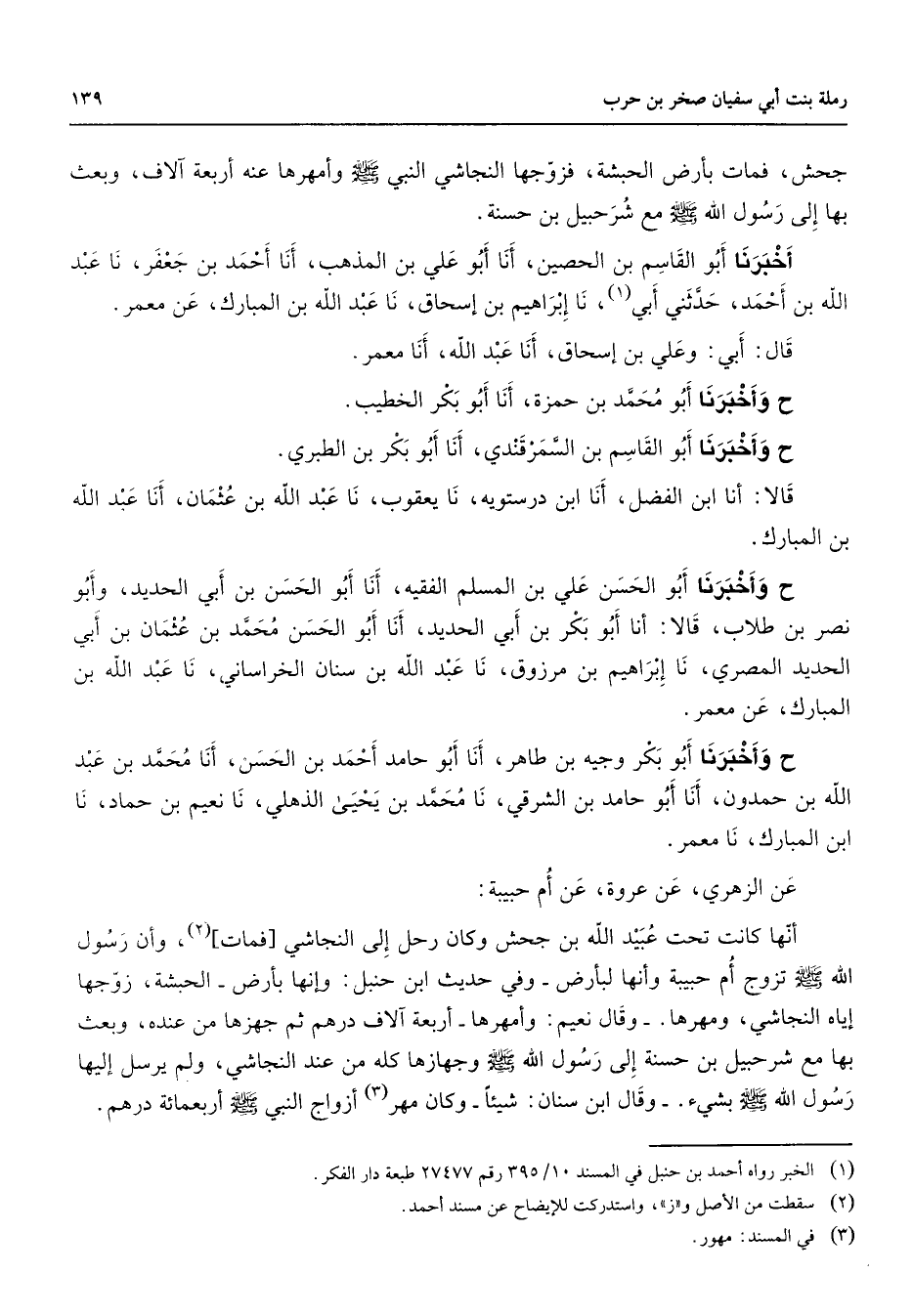 جحش فمات بأرض الحبشة فزوجها النجاشي النبي (صلى الله عليه وسلم) وأمهرها عنه أربعة آلاف وبعث بها إلى رسول الله (صلى الله عليه وسلم) مع شرحبيل بن حسنة أخبرنا أبو القاسم بن الحصين أنا أبو علي بن المذهب أنا أحمد بن جعفر نا عبد الله بن أحمد حدثني أبي (1) نا إبراهيم بن إسحاق نا عبد الله بن المبارك عن معمر قال أبي وعلي بن إسحاق أنا عبد الله أنا معمر وأخبرنا أبو محمد بن حمزة أنا أبو بكر الخطيب وأخبرنا أبو القاسم بن السمرقندي أنا أبو بكر بن الطبري قالا أنا ابن الفضل أنا ابن درستوية نا يعقوب نا عبد الله بن عثمان أنا عبد الله بن المبارك وأخبرنا أبو الحسن علي بن المسلم الفقيه أنا أبو الحسن بن أبي الحديد وأبو نصر بن طلاب قالا أنا أبو بكر بن أبي الحديد أنا أبو الحسن محمد بن عثمان بن أبي الحديد المصري نا إبراهيم بن مرزوق نا عبد الله بن سنان الخراساني نا عبد الله بن المبارك عن معمر وأخبرنا أبو بكر وجيه بن طاهر أنا أبو حامد أحمد بن الحسن أنا محمد بن عبد الله بن حمدون أنا أبو حامد بن الشرقي نا محمد بن يحيى الذهلي نا نعيم بن حماد نا ابن المبارك نا معمر عن الزهري عن عروة عن أم حبيبة أنها كانت تحت عبيد الله بن جحش وكان رحل إلى النجاشي فمات (2) وأن رسول الله (صلى الله عليه وسلم) تزوج أم حبيبة وأنها لبأرض وفي حديث ابن حنبل وإنها بأرض الحبشة زوجها إياه النجاشي ومهرها وقال نعيم وأمهرها أربعة آلاف درهم ثم جهزها من عنده وبعث بها مع شرحبيل بن حسنة إلى رسول الله (صلى الله عليه وسلم) وجهازها كله من عند النجاشي ولم يرسل إليها رسول الله (صلى الله عليه وسلم) بشئ وقال ابن سنان شيئا وكان مهر (3) أزواج النبي (صلى الله عليه وسلم) أربعمائة درهم