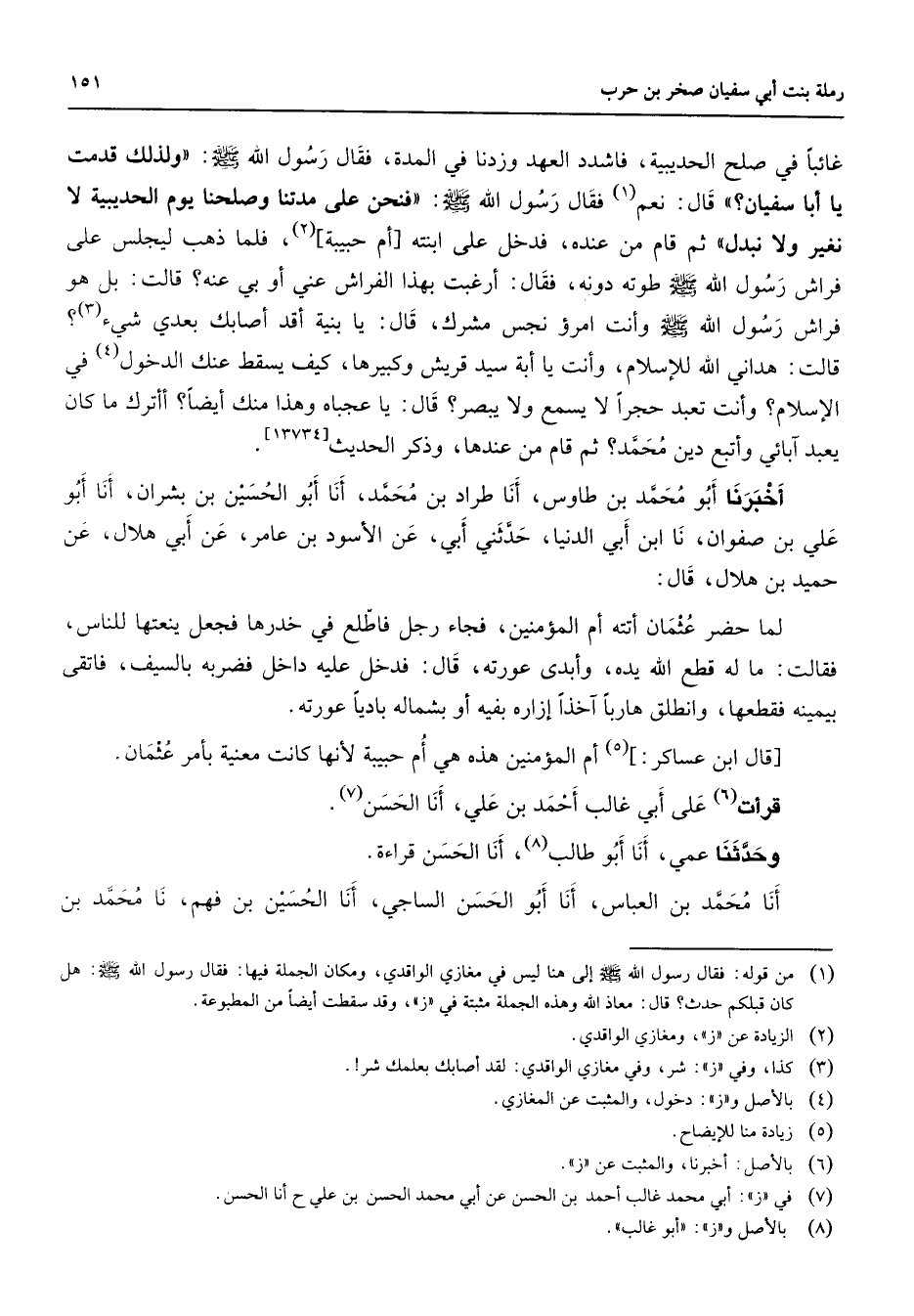 (1) من قوله: فقال رسول الله صلى الله عليه وآله وسلم إلى هنا ليس في مغازي الواقدي ومكان الجملة فيها: فقال رسول الله صلى الله عليه وآله وسلم: هل كان قبلكم حدث؟ قال: معاذ الله وهذه الجملة مثبتة في " ز " وقد سقطت أيضا من المطبوعة