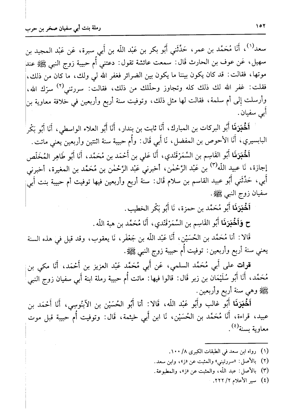 سعد (1) أنا محمد بن عمر حدثني أبو بكر بن عبد الله بن أبي سبرة عن عبد المجيد بن سهيل عن عوف بن الحارث قال سمعت عائشة تقول دعتني أم حبيبة زوج النبي (صلى الله عليه وسلم) عند موتها فقالت قد كان يكون بيننا ما يكون بين الضرائر فغفر الله لي ولك ما كان من ذلك فقلت غفر الله لك ذلك كله وتجاوز وحللك من ذلك فقالت سررتني (2) سرك الله وأرسلت إلى أم سلمة فقالت لها مثل ذلك وتوفيت سنة أربع وأربعين في خلافة معاوية بن أبي سفيان أخبرنا أبو البركات بن المبارك أنا ثابت بن بندار أنا أبو العلاء الواسطي أنا أبو بكر البابسيري أنا الأحوص بن المفضل نا أبي قال وأم حبيبة سنة اثنتين وأربعين يعني ماتت أخبرنا أبو القاسم بن السمرقندي أنا علي بن أحمد بن محمد أنا أبو طاهر المخلص إجازة نا عبيد الله (3) بن عبد الرحمن أخبرني عبد الرحمن بن محمد بن المغيرة أخبرني أبي حدثني أبو عبيد القاسم بن سلام قال سنة أربع وأربعين فيها توفيت أم حبيبة بنت أبي سفيان زوج النبي (صلى الله عليه وسلم) أخبرنا أبو محمد بن حمزة نا أبو بكر الخطيب ح وأخبرنا أبو القاسم بن السمرقندي أنا محمد بن هبة الله قالا أنا محمد بن الحسين أنا عبد الله بن جعفر نا يعقوب وقد قيل في هذه السنة يعني سنة أربع وأربعين توفيت أم حبيبة زوج النبي (صلى الله عليه وسلم) قرأت على ابي محمد السلمي عن أبي محمد عبد العزيز بن أحمد أنا مكي بن محمد أنا أبو سليمان بن زبر قال قالوا فيها ماتت أم حبيبة رملة ابنة أبي سفيان زوج النبي (صلى الله عليه وسلم) وهي سنة أربع وأربعين أخبرنا أبو غالب وأبو عبد الله قالا أنا أبو الحسين بن الآبنوسي أنا أحمد بن عبيد قراءة أنا محمد بن الحسين نا ابن أبي خيثمة قال وتوفيت أم حبيبة قبل موت معاوية بسنة (4)