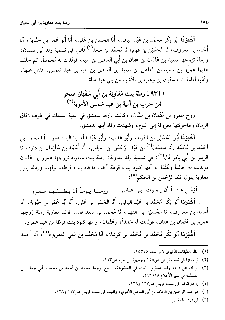 9341 - رملة بنت معاوية بن أبي سفيان صخر ابن حرب بن أمية بن عبد شمس الأموية (2) زوج عمر بن عثمان بن عفان وكانت دارها بدمشق في عقبة السمك في طرف زقاق الرمان وطاحونتها معروفة إلى اليوم وشهدت وفاة أبيها بدمشق أخبرنا أبو الحسين بن الفراء وأبو غالب وأبو عبد الله ابنا البنا قالوا أنا محمد بن أحمد بن محمد أنا محمد (3) بن عبد الرحمن بن العباس أنا أحمد بن سليمان بن داود نا الزبير بن ابي بكر قال (4) في تسمية ولد معاوية رملة بنت معاوية تزوجها عمرو بن عثمان فولدت له خالدا وعثمان أمها كنود بنت قرظة أخت فاختة بنت قرظة ولهند ورملة بنتي معاوية يقول عبد الرحمن بن الحكم (5) * أؤمل هندا أن يموت ابن عامر * ورملة يوما أن يطلقها عمرو * أخبرنا أبو بكر محمد بن عبد الباقي أنا الحسن بن علي أنا أبو عمر بن حيوية أنا أحمد بن معروف نا الحسين بن الفهم نا محمد بن سعد قال فولد معاوية رملة زوجها عمرو بن عثمان بن عفان فولدت له خالدا وعثمان وأمها كنود بنت قرظة بن عبد عمرو أخبرنا أبو بكر محمد بن محمد بن كرتيلا أنا محمد بن علي المقرئ (6) أنا أحمد