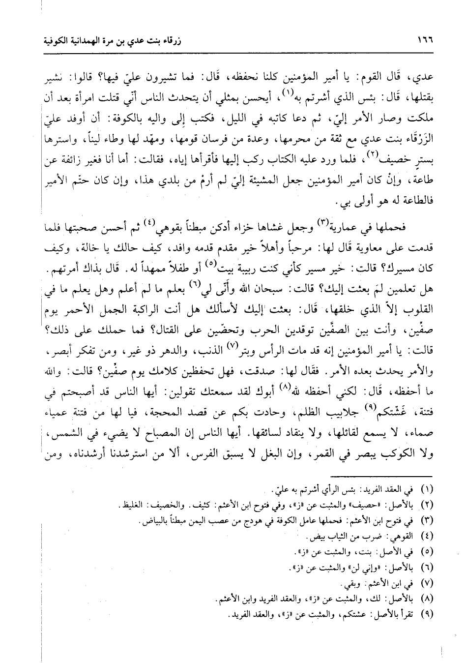 عدي قال القوم يا أمير المؤمنين كلنا نحفظه قال فما تشيرون علي فيها قالوا نشير بقتلها قال بئس الذي أشرتم به (1) أيحسن بمثلي أن يتحدث الناس أني قتلت امرأة بعد أن ملكت وصار الأمر إلي ثم دعا كاتبه في الليل فكتب إلى واليه بالكوفة أن أوفد علي الزرقاء بنت عدي مع ثقة من محرمها وعدة من فرسان قومها ومهد لها وطاء لينا واسترها بستر خصيف (2) فلما ورد عليه الكتاب ركب إليها فأقرأها إياه فقالت أما أنا فغير زائفة عن طاعة وإن كان أمير المؤمنين جعل المشيئة إلي لم أرم من بلدي هذا وإن كان حتم الأمير فالطاعة له هو أولى بي فحملها في عمارية (3) وجعل غشاها خزاء أدكن مبطنا بقوهي (4) ثم أحسن صحبتها فلما قدمت على معاوية قال لها مرحبا وأهلا خير مقدم قدمه وافد كيف حالك يا خالة وكيف كان مسيرك قالت خير مسير كأني كنت ربيبة بيت (5) أو طفلا ممهدا له قال بذاك أمرتهم هل تعلمين لم بعثت إليك قالت سبحان الله وإنى لي (6) بعلم ما لم أعلم وهل يعلم ما في القلوب إلا الذي خلقها قال بعثت إليك لأسألك هل أنت الراكبة الجمل الأحمر يوم صفين وأنت بين الصفين توقدين الحرب وتحضين على القتال فما حملك على ذلك قالت يا أمير المؤمنين إنه قد مات الرأس وبتر (7) الذنب والدهر ذو غير ومن تفكر أبصر والأمر يحدث بعده الأمر فقال لها صدقت فهل تحفظين كلامك يوم صفين قالت والله ما أحفظه قال لكني أحفظه لله (8) أبوك لقد سمعتك تقولين أيها الناس قد أصبحتم في فتنة غشتكم (9) جلابيب الظلم وحادت بكم عن قصد المحجة فيا لها من فتنة عمياء صماء لا يسمع لقائلها ولا ينقاد لسائقها أيها الناس إن المصباح لا يضئ في الشمس ولا الكوكب يبصر في القمر وإن البغل لا يسبق الفرس ألا من استرشدنا أرشدناه ومن