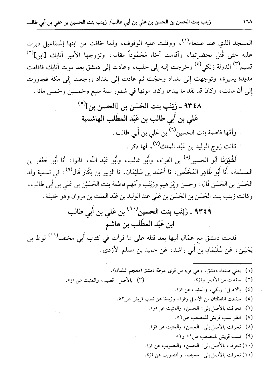 9349 - زينب بنت الحسين (10) بن علي بن أبي طالب ابن عبد المطلب بن هاشم قدمت دمشق مع عمال أبيها بعد قتله على ما قرأت في كتاب أبي مخنف (11) لوط بن يحيى عن سليمان بن أبي راشد عن حميد بن مسلم الأزدي