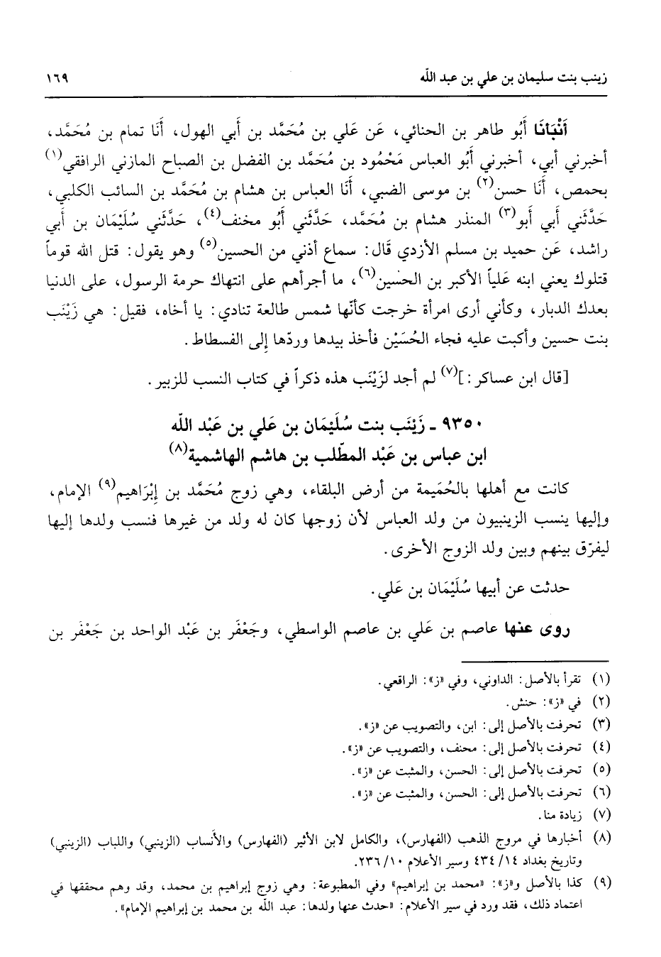9350 - زينب بنت سليمان بن علي بن عبد الله ابن عباس بن عبد المطلب بن هاشم الهاشمية (8) كانت مع أهلها بالحميمة من أرض البلقاء وهي زوج محمد بن إبراهيم (9) الإمام وإليها ينسب الزينبيون من ولد العباس لأن زوجها كان له ولد من غيرها فنسب ولدها إليها ليفرق بينهم وبين ولد الزوج الأخرى حدثت عن أبيها سليمان بن علي روى عنها عاصم بن علي بن عاصم الواسطي وجعفر بن عبد الواحد بن جعفر بن