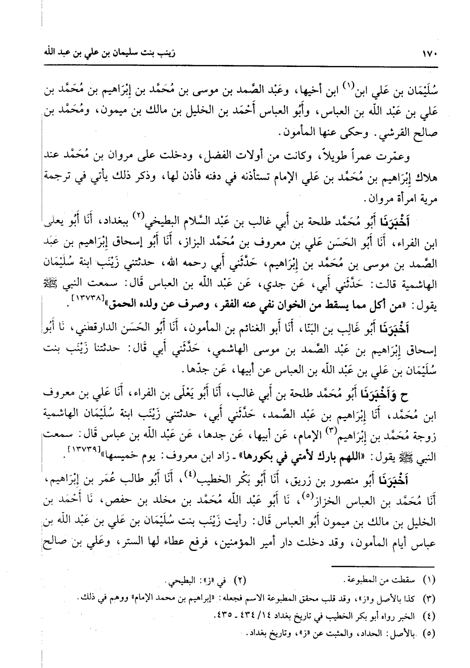 سليمان بن علي ابن (1) ابن أخيها وعبد الصمد بن موسى بن محمد بن إبراهيم بن محمد بن علي بن عبد الله بن العباس وأبو العباس أحمد بن الخليل بن مالك بن ميمون ومحمد بن صالح القرشي وحكى عنها المأمون وعمرت عمرا طويلا وكانت من أولات الفضل ودخلت على مروان بن محمد عند هلاك إبراهيم بن محمد بن علي الإمام تستأذنه في دفنه فاذن لها وذكر ذلك يأتي في ترجمة مرية امرأة مروان اخبرنا أبو محمد طلحة بن أبي غالب بن عبد السلام البطيخي (2) ببغداد أنا أبو يعلى ابن الفراء أنا أبو الحسن علي بن معروف بن محمد البزاز أنا أبو إسحاق إبراهيم بن عبد الصمد بن موسى بن محمد بن إبراهيم حدثني أبي رحمه الله حدثتني زينب ابنة سليمان الهاشمية قالت حدثني أبي عن جدي عن عبد الله بن العباس قال سمعت النبي (صلى الله عليه وسلم) يقول من أكل مما يسقط من الخوان نفي عنه الفقر وصرف عن ولده الحمق أخبرنا أبو غالب بن البنا أنا أبو الغنائم بن المأمون أنا أبو الحسن الدارقطني نا أبو إسحاق إبراهيم بن عبد الصمد بن موسى الهاشمي حدثني أبي قال حدثتنا زينب بنت سليمان بن علي بن عبد الله بن العباس عن أبيها عن جدها وأخبرنا أبو محمد طلحة بن أبي غالب أنا أبو يعلى بن الفراء أنا علي بن معروف ابن محمد أنا إبراهيم بن عبد الصمد حدثني أبي حدثتني زينب ابنة سليمان الهاشمية زوجة محمد بن إبراهيم (3) الإمام عن أبيها عن جدها عن عبد الله بن عباس قال سمعت النبي (صلى الله عليه وسلم) يقول اللهم بارك لأمتي في بكورها زاد ابن معروف يوم خميسها أخبرنا أبو منصور بن زريق أنا أبو بكر الخطيب (4) أنا أبو طالب عمر بن إبراهيم أنا محمد بن العباس الخزاز (5) نا أبو عبد الله محمد بن مخلد بن حفص نا أحمد بن الخليل بن مالك بن ميمون أبو العباس قال رأيت زينب بنت سليمان بن علي بن عبد الله بن عباس أيام المأمون وقد دخلت دار أمير المؤمنين فرفع عطاء لها الستر وعلي بن صالح