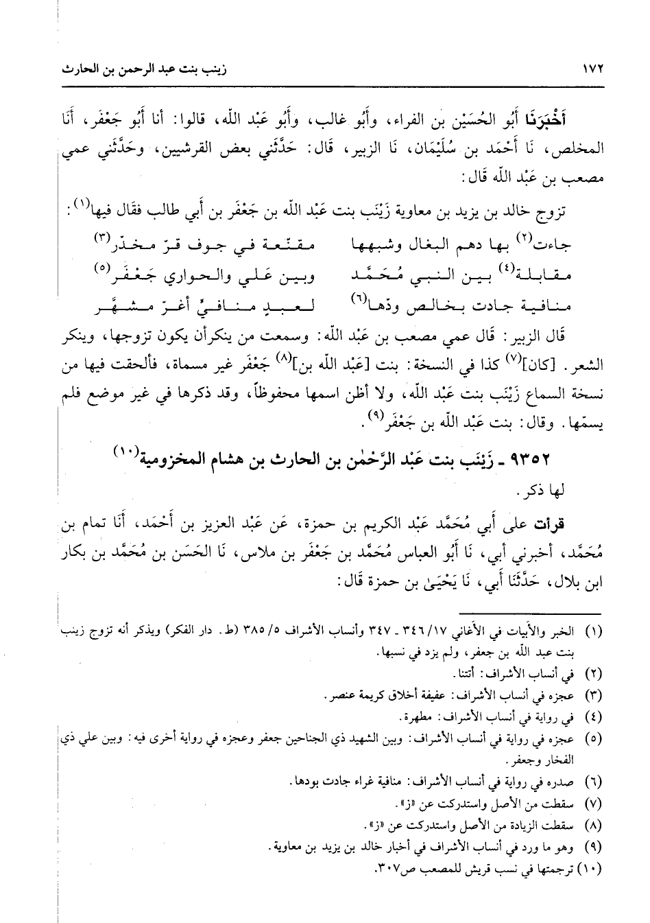 أخبرنا أبو الحسين بن الفراء وأبو غالب وأبو عبد الله قالوا أنا أبو جعفر أنا المخلص نا أحمد بن سليمان نا الزبير قال حدثني بعض القرشيين وحدثني عمي مصعب بن عبد الله قال تزوج خالد بن يزيد بن معاوية زينب بنت عبد الله بن جعفر بن أبي طالب فقال فيها (1) * جاءت (2) بها دهم البغال وشبهها * مقنعة في جوف قر مخدر (3) مقابلة (4) بين النبي محمد * وبين علي والحواري جعفر (5) منافية جادت بخالص ودها (6) * لعبد منافي أغر مشهر * قال الزبير قال عمي مصعب بن عبد الله وسمعت من ينكر أن يكون تزوجها وينكر الشعر كان (7) كذا في النسخة بنت عبد الله بن (8) جعفر غير مسماة فألحقت فيها من نسخة السماع زينب بنت عبد الله ولا أظن اسمها محفوظا وقد ذكرها في غير موضع فلم يسمها وقال بنت عبد الله بن جعفر (9)