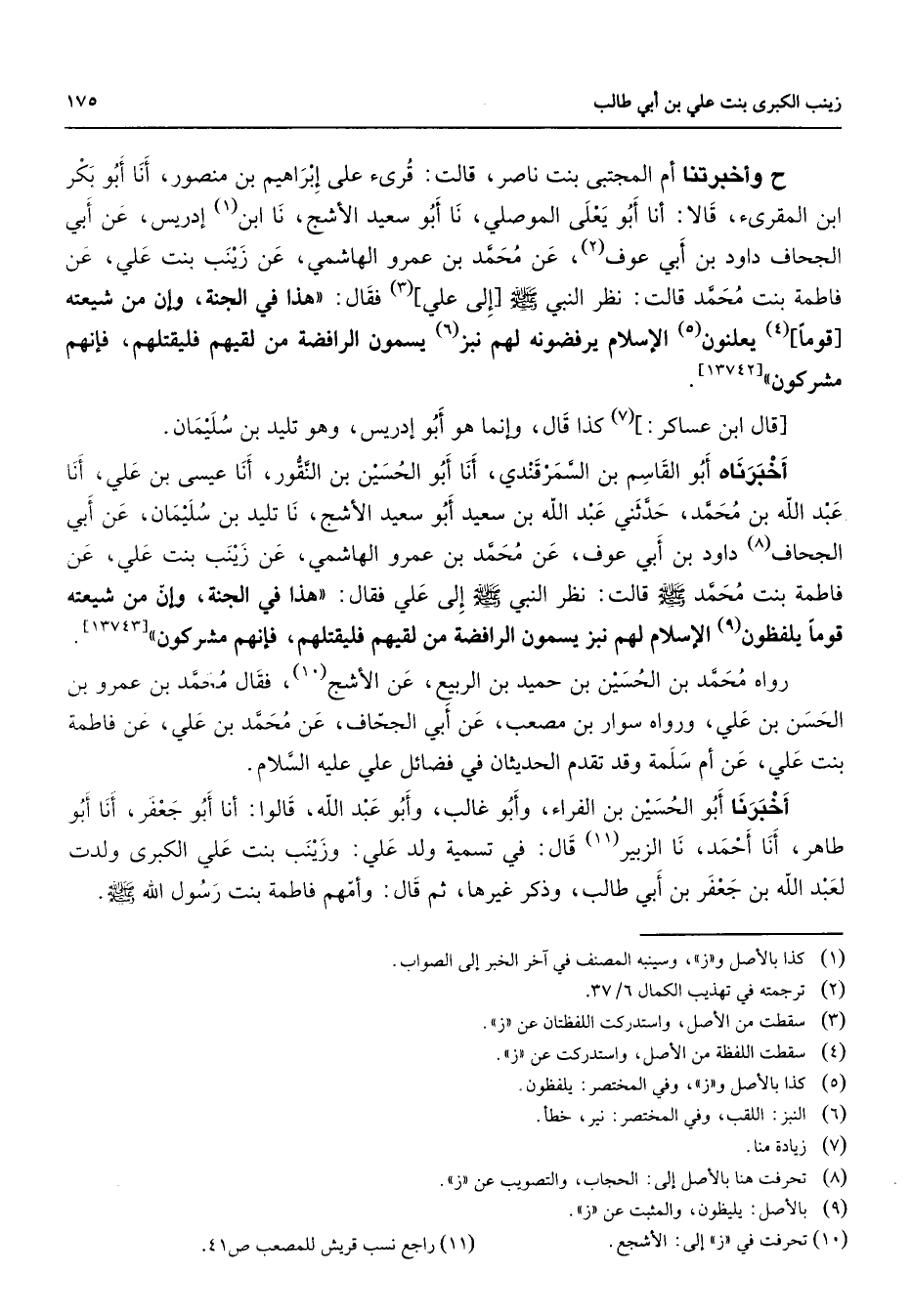 وأخبرتنا أم المجتبى بنت ناصر قالت قرئ على إبراهيم بن منصور أنا أبو بكر ابن المقرئ قالا أنا أبو يعلى الموصلي نا أبو سعيد الأشج نا ابن (1) إدريس عن أبي الحجاف داود بن أبي عوف (2) عن محمد بن عمرو الهاشمي عن زينب بنت علي عن فاطمة بنت محمد قالت نظر النبي (صلى الله عليه وسلم) إلى علي (3) فقال هذا في الجنة وإن من شيعته قوما (4) يعلنون (5) الإسلام يرفضونه لهم نبز (6) يسمون الرافضة من لقيهم فليقتلهم فإنهم مشركون قال ابن عساكر (7) كذا قال وإنما هو أبو إدريس وهو تليد بن سليمان أخبرناه أبو القاسم بن السمرقندي أنا أبو الحسين بن النقور أنا عيسى بن علي أنا عبد الله بن محمد حدثني عبد الله بن سعيد أبو سعيد الأشج نا تليد بن سليمان عن أبي الحجاف (8) داود بن أبي عوف عن محمد بن عمرو الهاشمي عن زينب بنت علي عن فاطمة بنت محمد (صلى الله عليه وسلم) قالت نظر النبي (صلى الله عليه وسلم) إلى علي فقال هذا في الجنة وإن من شيعته قوما يلفظون (9) الإسلام لهم نبز يسمون الرافضة من لقيهم فليقتلهم فإنهم مشركون رواه محمد بن الحسين بن حميد بن الربيع عن الأشج (10) فقال محمد بن عمرو بن الحسن بن علي ورواه سوار بن مصعب عن أبي الجحاف عن محمد بن علي عن فاطمة بنت علي عن أم سلمة وقد تقدم الحديثان في فضائل علي عليه السلام أخبرنا أبو الحسين بن الفراء وأبو غالب وأبو عبد الله قالوا أنا أبو جعفر أنا أبو طاهر أنا أحمد نا الزبير (11) قال في تسمية ولد علي وزينب بنت علي الكبرى ولدت لعبد الله بن جعفر بن أبي طالب وذكر غيرها ثم قال وأمهم فاطمة بنت رسول الله (صلى الله عليه وسلم)