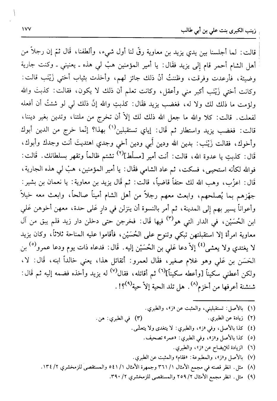 قالت لما أجلسنا بين يدي يزيد بن معاوية رق لنا أول شئ وألطفنا قال ثم إن رجلا من أهل الشام أحمر قام إلى يزيد فقال يا أمير المؤمنين هب لي هذه يعنيني وكنت جارية وضيئة فأرعدت وفرقت وظننت أن ذلك جائز لهم وأخذت بثياب أختي زينب قالت وكانت أختي زينب أكبر مني وأعقل وكانت تعلم أن ذلك لا يكون فقالت كذبت والله ولؤمت ما ذلك لك ولا له فغضب يزيد فقال كذبت والله إن ذلك لي لو شئت أن أفعله لفعلت قالت كلا والله ما جعل الله ذلك لك إلا أن تخرج من ملتنا وتدين بغير ديننا قالت فغضب يزيد واستطار ثم قال إياي تستقبلين (1) بهذا إنما خرج من الدين أبوك وأخوك فقالت زينب بدين الله ودين أبي ودين أخي وجدي اهتديت أنت وجدك وأبوك قال كذبت يا عدوة الله قالت أنت أمير مسلط (2) تشتم ظالما وتقهر بسلطانك قالت فوالله لكأنه استحيى فسكت ثم عاد الشامي فقال يا أمير المؤمنين هب لي هذه الجارية قال اعزب وهب الله لك حتفا قاضيا قالت ثم قال يزيد بن معاوية يا نعمان بن بشير جهزهم بما يصلحهم وابعث معهم رجلا من أهل الشام أمينا صالحا وابعث معه خيلا وأعوانا يسير بهم إلى المدينة ثم أمر بالنسوة أن ينزلن في دار على حدة معهن أخوهن علي ابن الحسين في الدار التي هو (3) فيها قال فخرجن حتى دخلن دار زيد فلم يبق من آل معاوية امرأة إلا استقبلتهن تبكي وتنوح على الحسين فأقاموا عليه المناحة ثلاثا وكان يزيد لا يغتدي ولا يعشى (4) إلا دعا علي بن الحسين إليه قال فدعاه ذات يوم ودعا عمرو (5) بن الحسن بن علي وهو غلام صغير فقال لعمرو أتقاتل هذا يعني خالدا ابنه قال لا ولكن أعطني سكينا وأعطه سكينا (6) ثم أقاتله فقال (7) له يزيد وأخذه فضمه إليه ثم قال شنشنة أعرفها من أخزم (8) هل تلد الحية إلا حية (9)