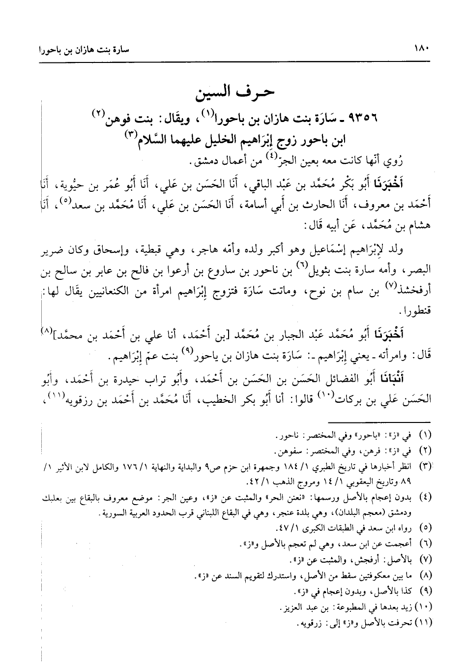 9356 - سارة بنت هازان بن باحورا (1) ويقال بنت فوهن (2) ابن باحور زوج إبراهيم الخليل عليهما السلام (3) روي أنها كانت معه بعين الجر (4) من أعمال دمشق أخبرنا أبو بكر محمد بن عبد الباقي أنا الحسن بن علي أنا أبو عمر بن حيوية أنا أحمد بن معروف أنا الحارث بن أبي أسامة أنا الحسن بن علي أنا محمد بن سعد (5) أنا هشام بن محمد عن أبيه قال ولد لإبراهيم إسماعيل وهو أكبر ولده وأمه هاجر وهي قبطية وإسحاق وكان ضرير البصر وأمه سارة بنت بثويل (6) بن ناحور بن ساروع بن أرعوا بن فالح بن عابر بن سالح بن أرفخشد (7) بن سام بن نوح وماتت سارة فتزوج إبراهيم امرأة من الكنعانيين يقال لها قنطورا أخبرنا أبو محمد عبد الجبار بن محمد بن أحمد أنا علي بن أحمد بن محمد (8) قال وامرأته يعني إبراهيم سارة بنت هازان بن يا حور (9) بنت عم إبراهيم أنبأنا أبو الفضائل الحسن بن الحسن بن أحمد وأبو تراب حيدرة بن أحمد وأبو الحسن علي بن بركات (10) قالوا أنا أبو بكر الخطيب أنا محمد بن أحمد بن رزقويه (11)