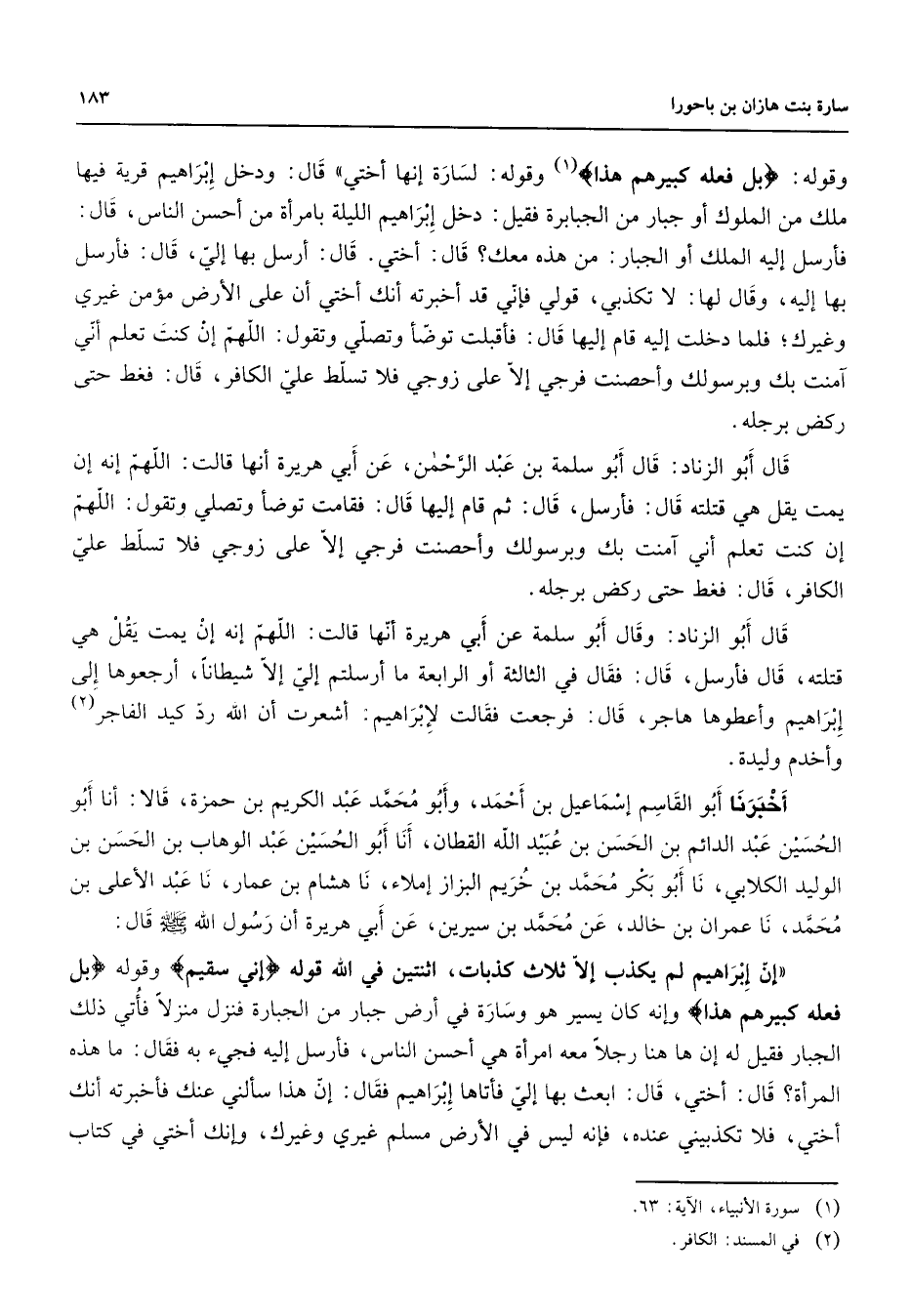 وقوله " بل فعله كبيرهم هذا " (1) وقوله لسارة إنها أختي قال ودخل إبراهيم قرية فيها ملك من الملوك أو جبار من الجبابرة فقيل دخل إبراهيم الليلة بامرأة من أحسن الناس قال فأرسل إليه الملك أو الجبار من هذه معك قال أختي قال أرسل بها إلي قال فأرسل بها إليه وقال لها لا تكذبي قولي فإني قد أخبرته أنك أختي أن على الأرض مؤمن غيري وغيرك فلما دخلت إليه قام إليها قال فأقبلت توضأ وتصلي وتقول اللهم إن كنت تعلم أني آمنت بك وبرسولك وأحصنت فرجي إلا على زوجي فلا تسلط علي الكافر قال فغط حتى ركض برجله قال أبو الزناد قال أبو سلمة بن عبد الرحمن عن أبي هريرة أنها قالت اللهم إنه إن يمت يقل هي قتلته قال فأرسل قال ثم قام إليها قال فقامت توضأ وتصلي وتقول اللهم إن كنت تعلم أني آمنت بك وبرسولك وأحصنت فرجي إلا على زوجي فلا تسلط علي الكافر قال فغط حتى ركض برجله قال أبو الزناد وقال أبو سلمة عن أبي هريرة أنها قالت اللهم إنه إن يمت يقل هي قتلته قال فأرسل قال فقال في الثالثة أو الرابعة ما أرسلتم إلي إلا شيطانا أرجعوها إلى إبراهيم وأعطوها هاجر قال فرجعت فقالت لإبراهيم أشعرت أن الله رد كيد الفاجر (2) وأخدم وليدة أخبرنا أبو القاسم إسماعيل بن أحمد وأبو محمد عبد الكريم بن حمزة قالا أنا أبو الحسين عبد الدائم بن الحسن بن عبيد الله القطان أنا أبو الحسين عبد الوهاب بن الحسن بن الوليد الكلابي نا أبو بكر محمد بن خريم البزاز إملاء نا هشام بن عمار نا عبد الأعلى بن محمد نا عمران بن خالد عن محمد بن سيرين عن أبي هريرة أن رسول الله (صلى الله عليه وسلم) قال إن إبراهيم لم يكذب إلا ثلاث كذبات اثنتين في الله قوله " إني سقيم " وقوله " بل فعله كبيرهم هذا " وإنه كان يسير هو وسارة في أرض جبار من الجبارة فنزل منزلا فأتي ذلك الجبار فقيل له إن هاهنا رجلا معه امرأة هي أحسن الناس فأرسل إليه فجئ به فقال ما هذه المرأة قال أختي قال ابعث بها إلي فأتاها إبراهيم فقال إن هذا سألني عنك فأخبرته أنك أختي فلا تكذبيني عنده فإنه ليس في الأرض مسلم غيري وغيرك وإنك أختي في كتاب