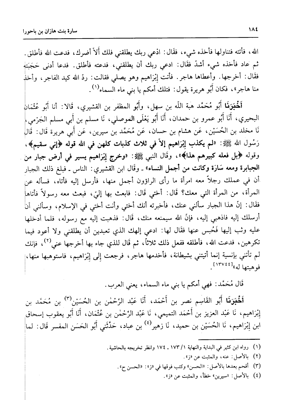 الله فأتته فتناولها فأخذه شئ فقال ادعي ربك يطلقني فلك ألا أضرك فدعت الله فأطلق ثم عاد فأخذه شئ أشد فقال ادعي ربك أن يطلقني فدعته فأطلق فدعا أدنى حجبته فقال أخرجها وعطاها هاجر فأتت إبراهيم وهو يصلي فقالت رد الله كيد الفاجر وأخذ منه هاجر فكان أبو هريرة يقول فتلك أمكم يا بني ماء السماء (1) أخبرنا أبو محمد هبة الله بن سهل وأبو المظفر بن القشيري قالا أنا أبو عثمان البحيري أنا أبو عمرو بن حمدان أنا أبو يعلى الموصلي نا مسلم بن أبي مسلم الجرمي نا مخلد بن الحسين عن هشام بن حسان عن محمد بن سيرين عن أبي هريرة قال قال رسول الله (صلى الله عليه وسلم) لم يكذب إبراهيم إلا في ثلاث كذبات كلهن في الله قوله " إني سقيم " وقوله " بل فعله كبيرهم هذا " وقال النبي (صلى الله عليه وسلم) وخرج إبراهيم يسير في أرض جبار من الجبابرة ومعه سارة وكانت من أجمل النساء وقال ابن القشيري الناس فبلغ ذلك الجبار أن في عملك رجلا معه امرأة ما رأى الراؤون أجمل منها فأرسل إليه فأتاه فسأله عن المرأة من المرأة التي معك قال أختي قال فابعث بها إلي فبعث معه رسولا فأتاها فقال إن هذا الجبار سألني عنك فأخبرته أنك أختي في الإسلام وسألني أن أرسلك إليه فاذهبي إليه فإن الله سيمنعه منك قال فذهبت إليه مع رسوله فلما أدخلها عليه وثب إليها فحبس عنها فقال لها ادعي إلهك الذي تعبدين أن يطلقني ولا أعود فيما تكرهين فدعت الله فأطلقه ففعل ذلك ثلاثا ثم قال للذي جاء بها أخرجها عني (2) فإنك لم تأتني بإنسية إنما أتيتني بشيطانة فأخذمها هاجر فرجعت إلى إبراهيم فاستوهبها منها فوهبتها له قال محمد فهي أمكم يا بني ماء السماء يعني العرب أخبرنا أبو القاسم نصر بن أحمد أنا عبد الرحمن بن الحسين (3) بن محمد بن إبراهيم نا عبد العزيز بن أحمد التميمي نا عبد الرحمن بن عثمان أنا أبو يعقوب إسحاق ابن إبراهيم نا الحسين بن حميد نا زهير (4) بن عباد حدثني أبو الحسن المفسر قال لما