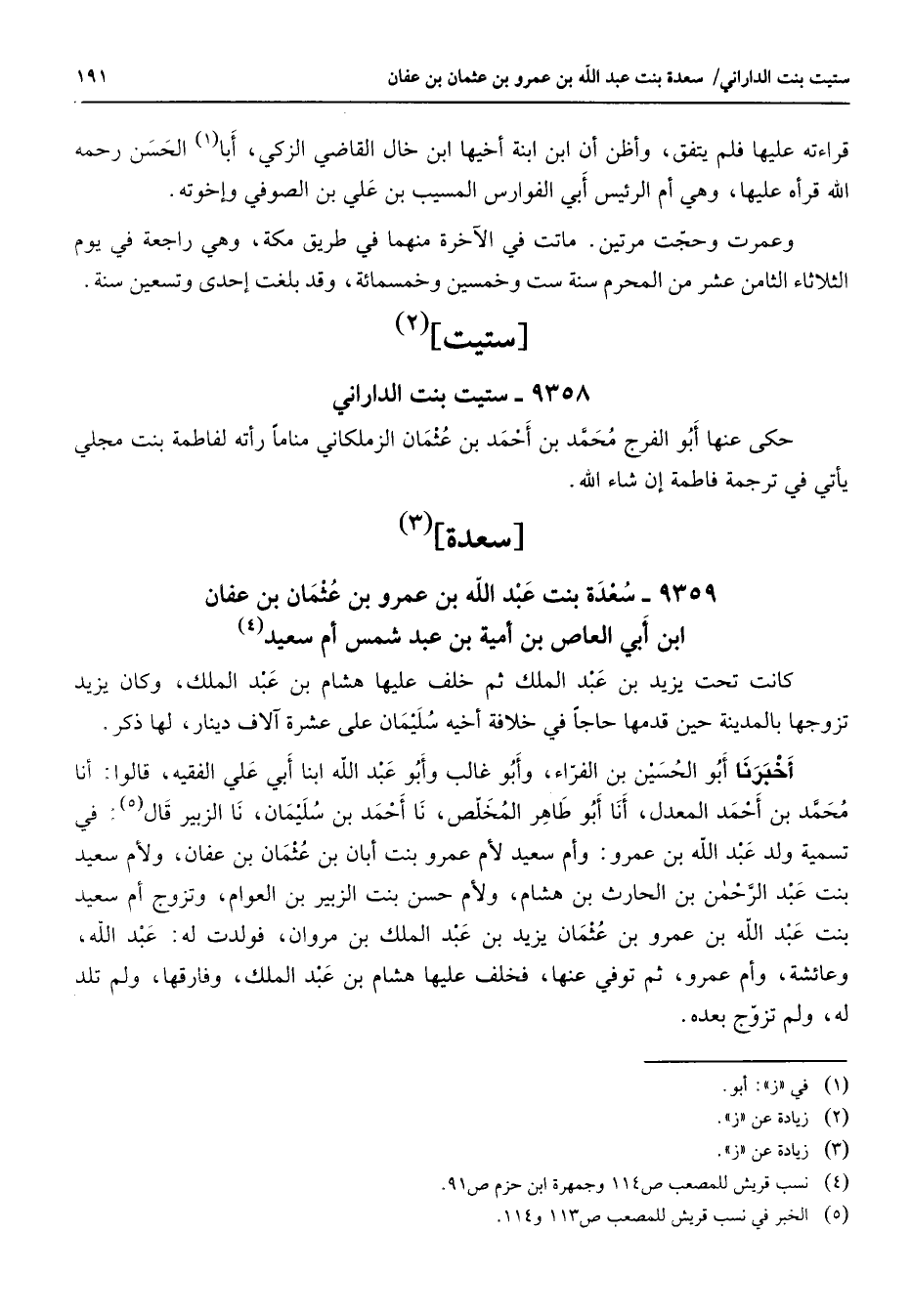 9359 - سعدة بنت عبد الله بن عمرو بن عثمان بن عفان ابن أبي العاص بن أمية بن عبد شمس أم سعيد (4) كانت تحت يزيد بن عبد الملك ثم خلف عليها هشام بن عبد الملك وكان يزيد تزوجها بالمدينة حين قدمها حاجا في خلافة أخيه سليمان على عشرة آلاف دينار لها ذكر أخبرنا أبو الحسين بن الفراء وأبو غالب وأبو عبد الله ابنا أبي علي الفقيه قالوا أنا محمد بن أحمد المعدل أنا أبو طاهر المخلص نا أحمد بن سليمان نا الزبير قال (5) في تسمية ولد عبد الله بن عمرو وأم سعيد لأم عمرو بنت أبان بن عثمان بن عفان ولأم سعيد بنت عبد الرحمن بن الحارث بن هشام ولأم حسن بنت الزبير بن العوام وتزوج أم سعيد بنت عبد الله بن عمرو بن عثمان يزيد بن عبد الملك بن مروان فولدت له عبد الله وعائشة وأم عمرو ثم توفي عنها فخلف عليها هشام بن عبد الملك وفارقها ولم تلد له ولم تزوج بعده