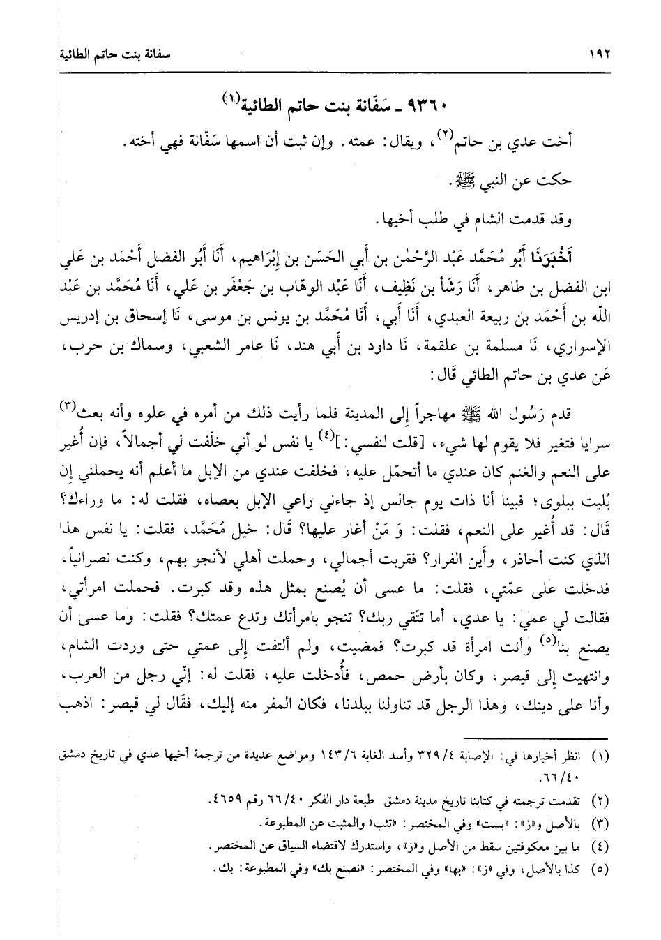 9360 - سفانه بنت حاتم الطائية (1) أخت عدي بن حاتم (2) ويقال عمته وإن ثبت أن اسمها سفانة فهي أخته حكت عن النبي (صلى الله عليه وسلم) وقد قدمت الشام في طلب أخيها أخبرنا أبو محمد عبد الرحمن بن أبي الحسن بن إبراهيم أنا أبو الفضل أحمد بن علي ابن الفضل بن طاهر أنا رشأ بن نظيف أنا عبد الوهاب بن جعفر بن علي أنا محمد بن عبد الله بن أحمد بن ربيعة العبدي أنا أبي أنا محمد بن يونس بن موسى نا إسحاق بن إدريس الإسواري نا مسلمة بن علقمة نا داود بن أبي هند نا عامر الشعبي وسماك بن حرب عن عدي بن حاتم الطائي قال قدم رسول الله (صلى الله عليه وسلم) مهاجرا إلى المدينة فلما رأيت ذلك من أمره في علوه وأنه بعث (3) سرايا فتغير فلا يقوم لها شئ قلت لنفسي (4) يا نفس لو أني خلفت لي أجمالا فإن أغير على النعم والغنم كان عندي ما أتحمل عليه فخلفت عندي من الإبل ما أعلم أنه يحملني إن بليت ببلوى فبينا أنا ذات يوم جالس إذ جاءني راعي الإبل بعصاه فقلت له ما وراءك قال قد أغير على النعم فقلت ومن أغار عليها قال خيل محمد فقلت يا نفس هذا الذي كنت أحاذر وأين الفرار فقربت أجمالي وحملت أهلي لأنجو بهم وكنت نصرانيا فدخلت على عمتي فقلت ما عسى أن يصنع بمثل هذه وقد كبرت فحملت امرأتي فقالت لي عمي يا عدي أما تتقي ربك تنجو بامرأتك وتدع عمتك فقلت وما عسى أن يصنع بنا (5) وأنت امرأة قد كبرت فمضيت ولم ألتفت إلى عمتي حتى وردت الشام وانتهيت إلى قيصر وكان بأرض حمص فأدخلت عليه فقلت له إني رجل من العرب وأنا على دينك وهذا الرجل قد تناولنا ببلدنا فكان المفر منه إليك فقال لي قيصر اذهب