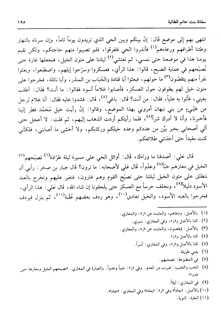 انتهى بهم إلى موضع قال إن بينكم وبين الحي الذي تريدون يوما تاما وإن سرناه بالنهار وطئنا أطرافهم ورعاءهم (1) فأنذروا الحي فتفرقوا فلم تصيبوا منهم حاجتكم ولكن نقيم يومنا هذا في موضعنا حتى نمسي ثم نعتشي (2) ليلتنا على متون الخيل فنجعلها غارة حتى نصبحهم في عماية الصبح قالوا هذا الرأي فعسكروا وسرحوا إبلهم واصطنعوا وبعثوا نفرا منهم يتقصون (3) ما حولهم فبعثوا أبا قتادة والحباب بن المنذر وأبا نائلة فخرجوا على متون خيل لهم يطوفون حول العسكر فأصابوا غلاما أسود فقالوا ما أنت فقال أطلب بغيتي فأتوا به عليا فقال من أنت قال باغي (4) قال فشدوا عليه فقال أنا غلام لرجل من طيئ من بني نبهان أمروني بهذا الموضع وقالوا إن رأيت خيل محمد فطر إلينا فأخبرنا وأنا لا أدرك شرا (5) فلما رأيتكم أردت الذهاب إليهم ثم قلت لا أعجل حتى آتي أصحابي بخبر بين من عددكم وعدة خيلكم وركابكم ولا أخشى ما أصابني فلكأني كنت مقيدا حتى أخذتني طلائعكم قال علي أصدقنا ما وراءك قال أوائل الحي على مسيرة ليلة طرادة (6) تصبحهم (7) الخيل في مغارهم خبا (8) وعدوا قال علي لأصحابه ما ترون قال جبار بن صخر رأيي أن ننطلق على متون الخيل ليلتنا حتى نصبح القوم وهم غارون فنغير عليهم ونخرج بالعبد الأسود دليلا (9) ونخلف حرسا مع العسكر حتى يلحقونا إن شاء الله قال علي هذا الرأي فخرجوا بالعبد الأسود والخيل تعادي (10) وهو ردف بعضهم عقبة (11) ثم ينزل فيردف