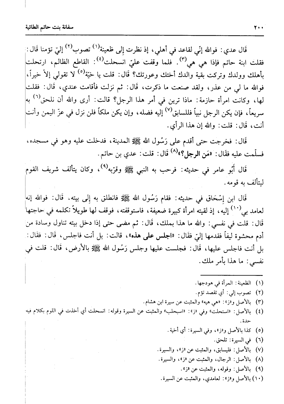 قال عدي فوالله إني لقاعد في أهلي إذ نظرت إلى ظعينة (1) تصوب (2) إلي تؤمنا قال فقلت ابنة حاتم فإذا هي هي (3) فلما وقفت علي انسحلت (4) القاطع الظالم ارتحلت بأهلك وولدك وتركت بقية والدك أختك وعورتك قال قلت يا خية (5) لا تقولي إلا خيرا فوالله ما لي من عذر ولقد صنعت ما ذكرت قال ثم نزلت فأقامت عندي قال فقلت لها وكانت امرأة حازمة ماذا ترين في أمر هذا الرجل قالت أرى والله أن نلحق (6) به سريعا فإن يكن الرجل نبيا فللسابق (7) إليه فضله وإن يكن ملكا فلن نذل في عز اليمن وأنت أنت قال قلت والله إن هذا الرأي قال فخرجت حتى أقدم على رسول الله (صلى الله عليه وسلم) المدينة فدخلت عليه وهو في مسجده فسلمت عليه فقال من الرجل (8) قال قلت عدي بن حاتم قال أبو عامر في حديثه فرحب به النبي (صلى الله عليه وسلم) وقربه (9) وكان يتألف شريف القوم ليتألف به قومه قال ابن إسحاق في حديثه فقام رسول الله (صلى الله عليه وسلم) فانطلق به إلى بيته قال فوالله إنه لعامد بي (10) إليه إذ لقيته امرأة كبيرة ضعيفة فاستوقفته فوقف لها طويلا نكلمه في حاجتها قال قلت في نفسي والله ما هذا بملك قال ثم مضى حتى إذا دخل بيته تناول وسادة من أدم محشوة ليفا فقدمها إلي فقال اجلس على هذه قالت بل أنت فاجلس قال فقال بل أنت فاجلس عليها قال فجلست عليها وجلس رسول الله (صلى الله عليه وسلم) بالأرض قال قلت في نفسي ما هذا بأمر ملك