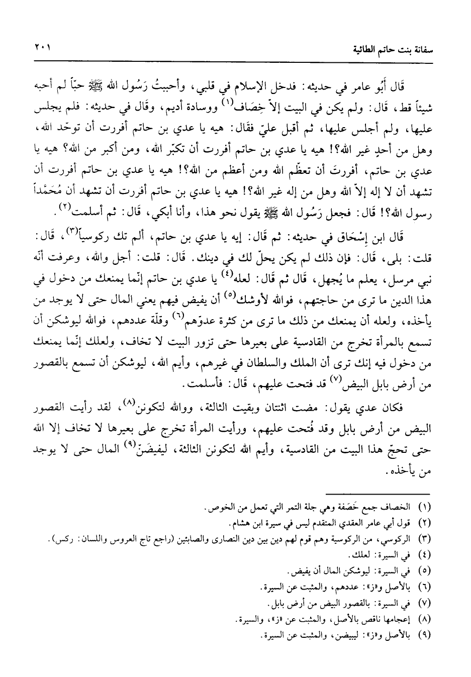 قال أبو عامر في حديثه فدخل الإسلام في قلبي وأحببت رسول الله (صلى الله عليه وسلم) حبا لم أحبه شيئا قط قال ولم يكن في البيت إلا خصاف (1) ووسادة أديم وقال في حديثه فلم يجلس عليها ولم أجلس عليها ثم أقبل علي فقال هيه يا عدي بن حاتم أفررت أن توحد الله وهل من أحد غير الله هيه يا عدي بن حاتم أفررت أن تكبر الله ومن أكبر من الله هيه يا عدي بن حاتم أفررت أن تعظم الله ومن أعظم من الله هيه يا عدي بن حاتم أفررت أن تشهد أن لا إله إلا الله وهل من إله غير الله هيه يا عدي بن اتم أفررت أن تشهد أن محمدا رسول الله قال فجعل رسول الله (صلى الله عليه وسلم) يقول نحو هذا وأنا أبكي قال ثم أسلمت (2) قال ابن إسحاق في حديثه ثم قال إيه يا عدي بن حاتم ألم تك ركوسيا (3) قال قلت بلى قال فإن ذلك لم يكن يحل لك في دينك قال قلت أجل والله وعرفت أنه نبي مرسل يعلم ما يجهل قال ثم قال لعله (4) يا عدي بن حاتم إنما يمنعك من دخول في هذا الدين ما ترى من حاجتهم فوالله لأوشك (5) أن يفيض فيهم يعني المال حتى لا يوجد من يأخذه ولعله أن يمنعك من ذلك ما ترى من كثرة عدوهم (6) وقلة عددهم فوالله ليوشكن أن تسمع بالمرأة تخرج من القادسية على بعيرها حتى تزور البيت لا تخاف ولعلك إنما يمنعك من دخول فيه إنك ترى أن الملك والسلطان في غيرهم وأيم الله ليوشكن أن تسمع بالقصور من أرض بابل البيض (7) قد فتحت عليهم قال فأسلمت فكان عدي يقول مضت اثنتان وبقيت الثالثة ووالله لتكونن (8) لقد رأيت القصور البيض من ارض بابل وقد فتحت عليهم ورأيت المرأة تخرج على بعيرها لا تخاف إلا الله حتى تحج هذا البيت من القادسية وايم الله لتكونن الثالثة ليفيضن (9) المال حتى لا يوجد من يأخذه