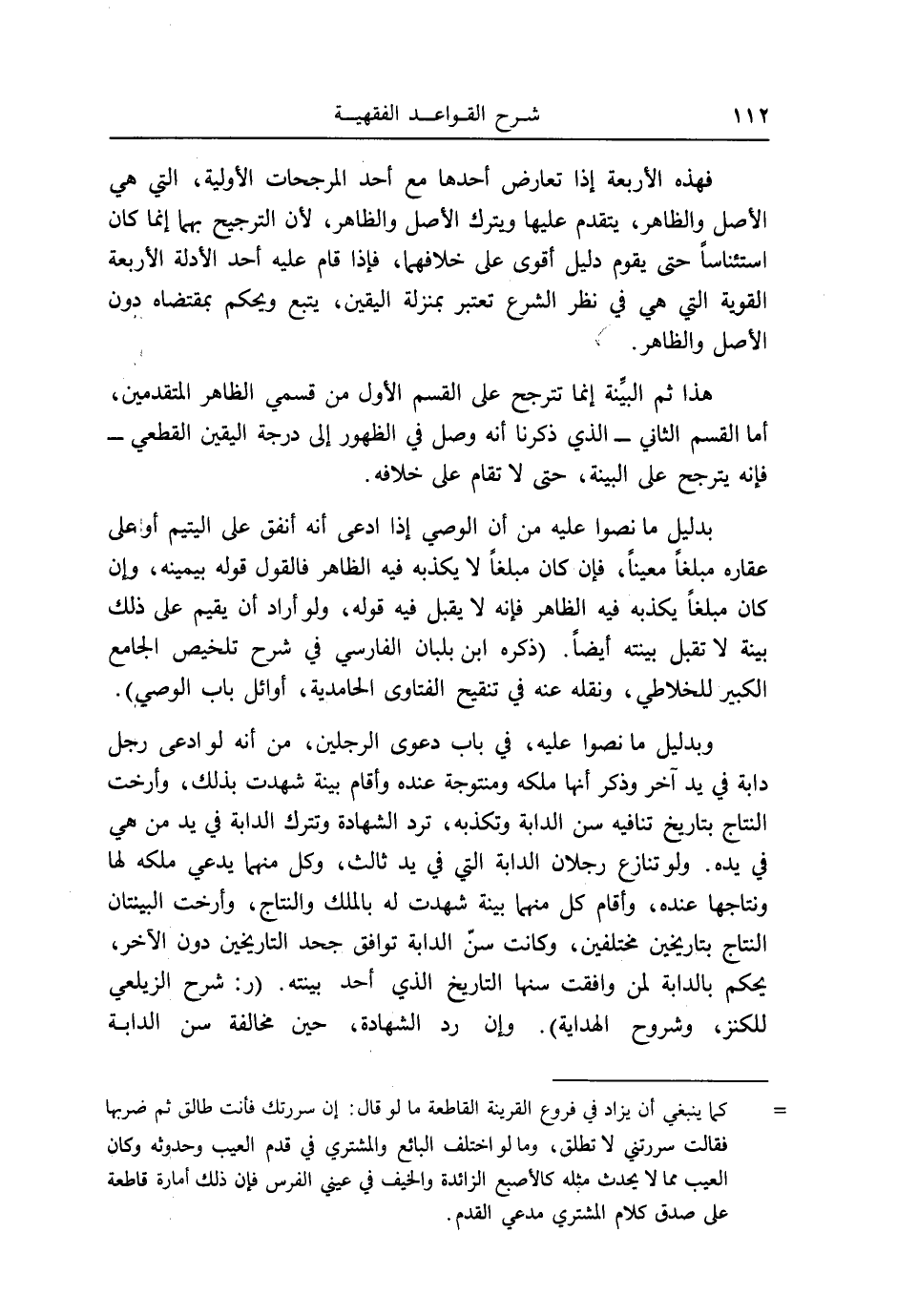 هَذَا ثمَّ الْبَيِّنَة إِنَّمَا تترجح على الْقسم الأول من قسمي الظَّاهِر الْمُتَقَدِّمين، أما الْقسم الثَّانِي _ الَّذِي ذكرنَا أَنه وصل فِي الظُّهُور إِلَى دَرَجَة الْيَقِين الْقطعِي _ فَإِنَّهُ يتَرَجَّح على الْبَيِّنَة، حَتَّى لَا تُقَام على خِلَافه.
