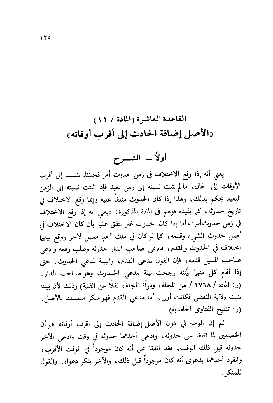 يَعْنِي أَنه إِذا وَقع الِاخْتِلَاف فِي زمن حُدُوث أَمر فَحِينَئِذٍ ينْسب إِلَى أقرب الْأَوْقَات إِلَى الْحَال، مَا لم تثبت نسبته إِلَى زمن بعيد فَإِذا ثبتَتْ نسبته إِلَى الزَّمن الْبعيد يحكم بذلك، وَهَذَا إِذا كَانَ الْحُدُوث مُتَّفقا عَلَيْهِ وَإِنَّمَا وَقع الِاخْتِلَاف فِي تَارِيخ حُدُوثه، كَمَا يفِيدهُ قَوْلهم فِي الْمَادَّة الْمَذْكُورَة: " يَعْنِي أَنه إِذا وَقع الِاخْتِلَاف فِي زمن حُدُوث أَمر "، أما إِذا كَانَ الْحُدُوث غير مُتَّفق عَلَيْهِ بِأَن كَانَ الِاخْتِلَاف فِي أصل حُدُوث الشَّيْء وَقدمه، كَمَا لَو كَانَ فِي ملك أحدٍ مسيل لآخر وَوَقع بَينهمَا اخْتِلَاف فِي الْحُدُوث والقدم، فَادّعى صَاحب الدَّار حُدُوثه وَطلب رَفعه وَادّعى صَاحب المسيل قدمه، فَإِن القَوْل لمُدعِي الْقدَم، وَالْبَيِّنَة لمُدعِي الْحُدُوث، حَتَّى إِذا أَقَامَ كل مِنْهُمَا بَينته رجحت بَيِّنَة مدعي الْحُدُوث وَهُوَ صَاحب الدَّار. (ر: الْمَادَّة / ١٧٦٨ / من الْمجلة، ومرآة الْمجلة، نقلا عَن الْقنية) وَذَلِكَ لِأَن بَينته تثبت ولَايَة النَّقْض فَكَانَت أولى، أما مدعي الْقدَم فَهُوَ مُنكر متمسك بِالْأَصْلِ. (ر: تَنْقِيح الْفَتَاوَى الحامدية) .