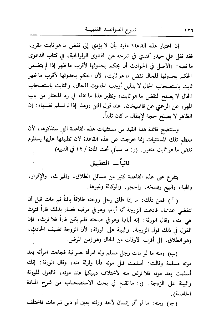 وستتضح فَائِدَة هَذَا الْقَيْد من مستثنيات هَذِه الْقَاعِدَة الَّتِي سنذكرها، لِأَن مُعظم تِلْكَ المستثنيات إِنَّمَا خرجت عَن هَذِه الْقَاعِدَة لِأَن تطبيقها عَلَيْهَا يسْتَلْزم نقض مَا هُوَ ثَابت متقرر. (ر: مَا سَيَأْتِي تَحت الْمَادَّة / ١٢ فِي التَّنْبِيه) .